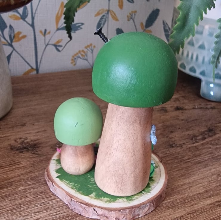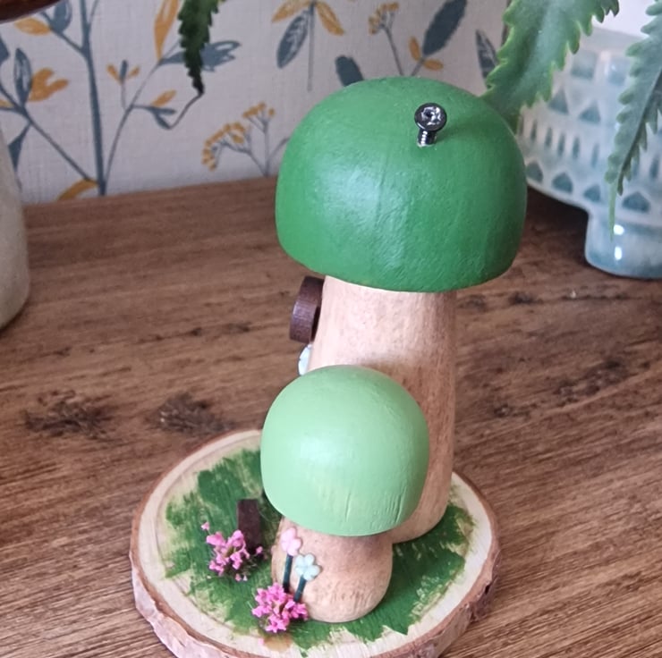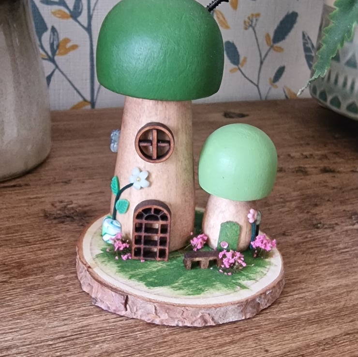 2 gorgeous wooden mushrooms houses sitting on a wooden slice made into a magical garden.