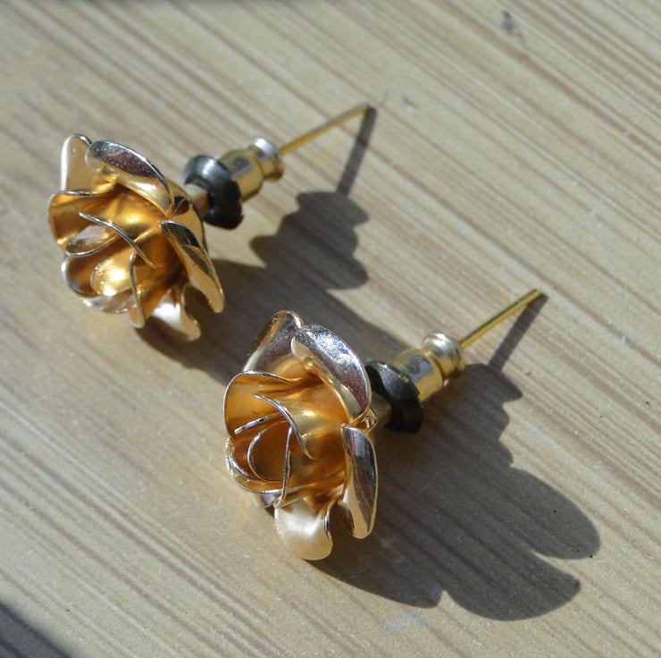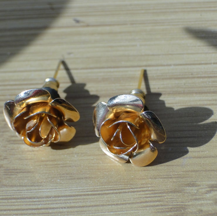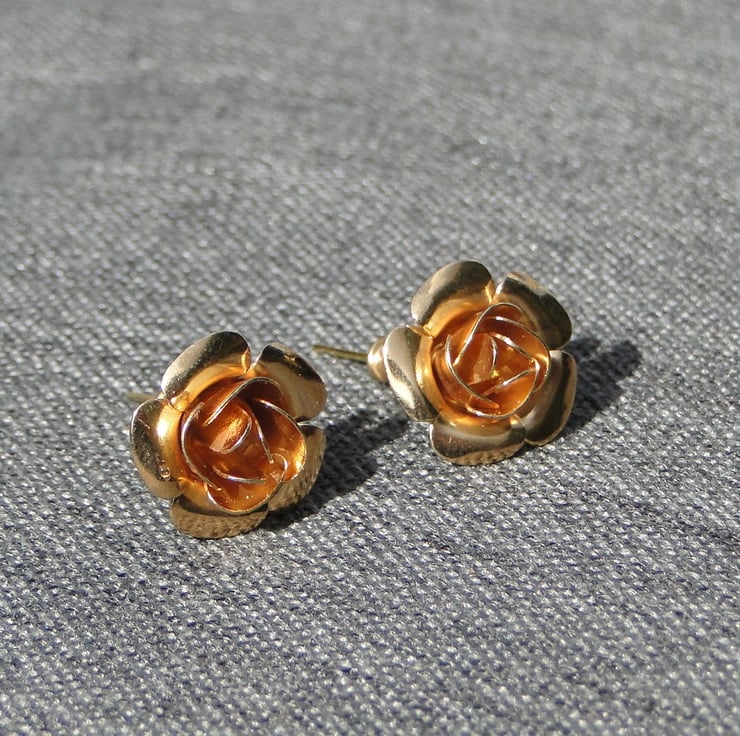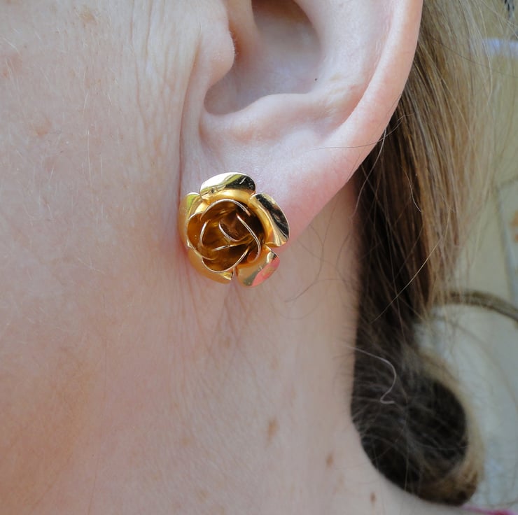 Stud earrings made of gold coloured metal in the shape of a rose.