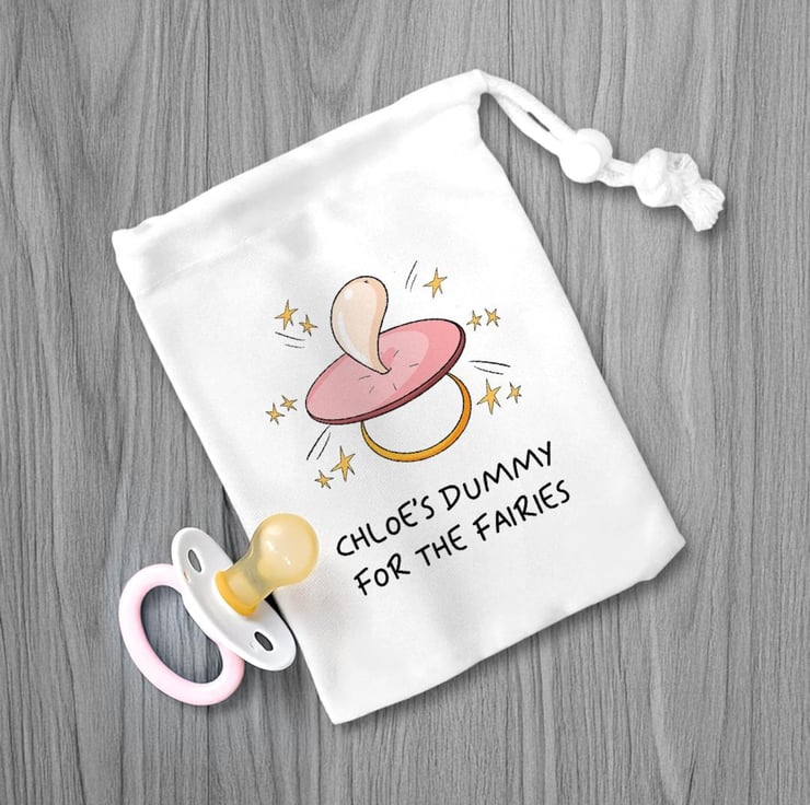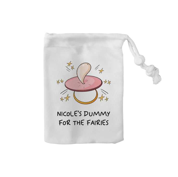 Make your child’s transition from dummies extra magical with this Personalised Dummy Bag for the Fairy! This adorable canvas drawstring bag is the perfect way to store dummies before sending them off to the fairies. Featuring a whimsical design with your child’s name (up to 12 characters) It’s both a practical solution and a cherished keepsake for this important milestone.Key Features:Personalised for Your Child: Add their name (up to 12 characters) for a unique and thoughtful touch.Premium Canvas Material: Made from high-quality canvas with a secure drawstring and stopper for durability.Perfect Keepsake: A delightful way to commemorate the Dummy Fairy tradition.Compact Size: Measures 15cm x 20cmperfect for little hands and easy storage.Why It’s Special:This bag turns the transition from dummies into a magical and memorable experience. Whether as part of a bedtime ritual or a fun gift alongside the Dummy Fairy storybook, it’s a practical yet sentimental keepsake that kids and parents will treasure.What’s Included:1x Personalised Canvas Dummy BagHow to Order:Enter the child’s name (up to 12 characters) in the personalisation box.Add to basket and complete your orderwe’ll handle the rest!