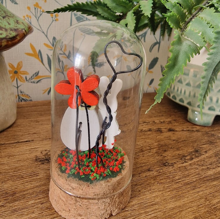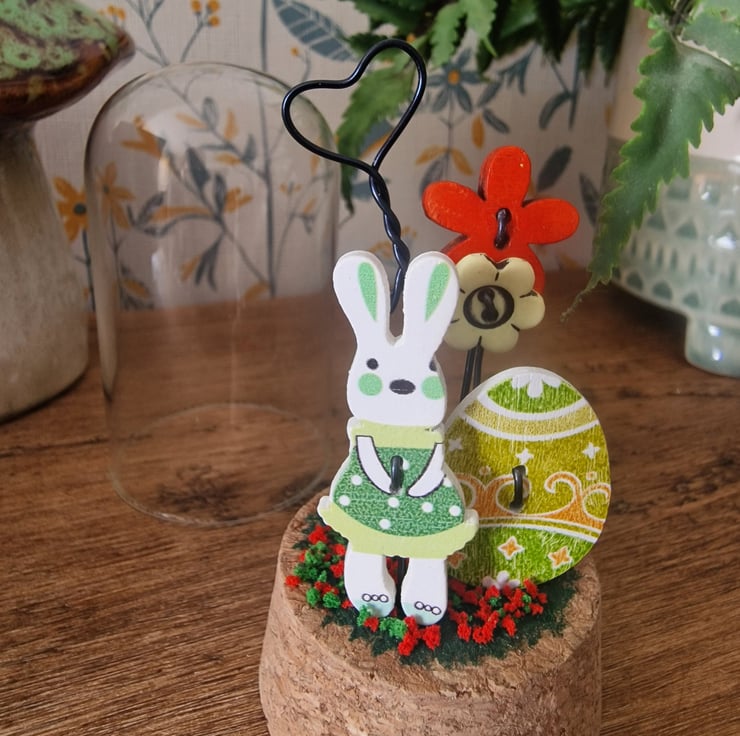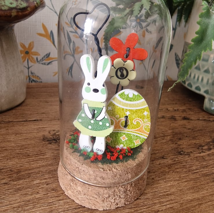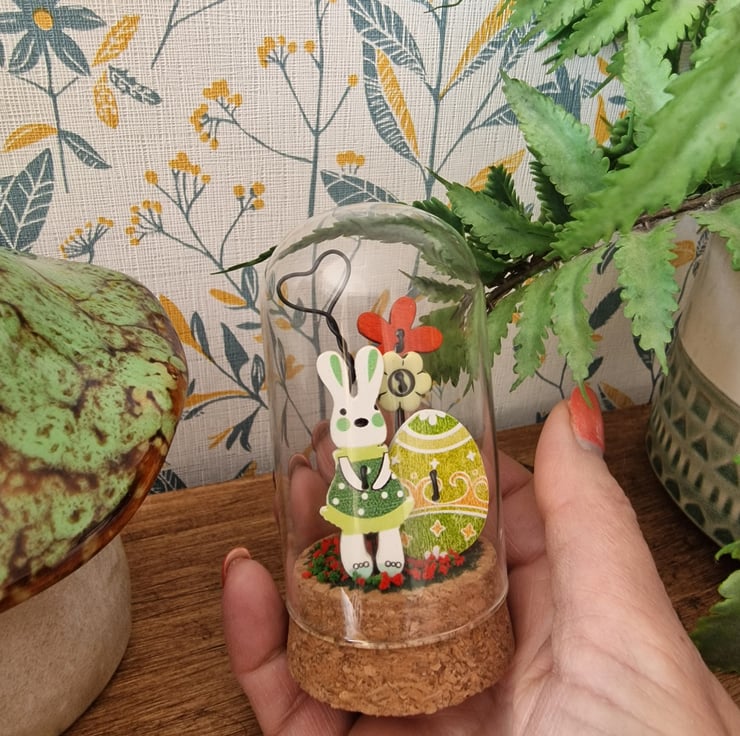 A cute glass dome on a Cork base featuring a Easter bunny & egg sitting in a magical garden.
