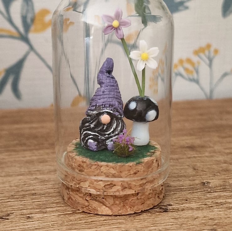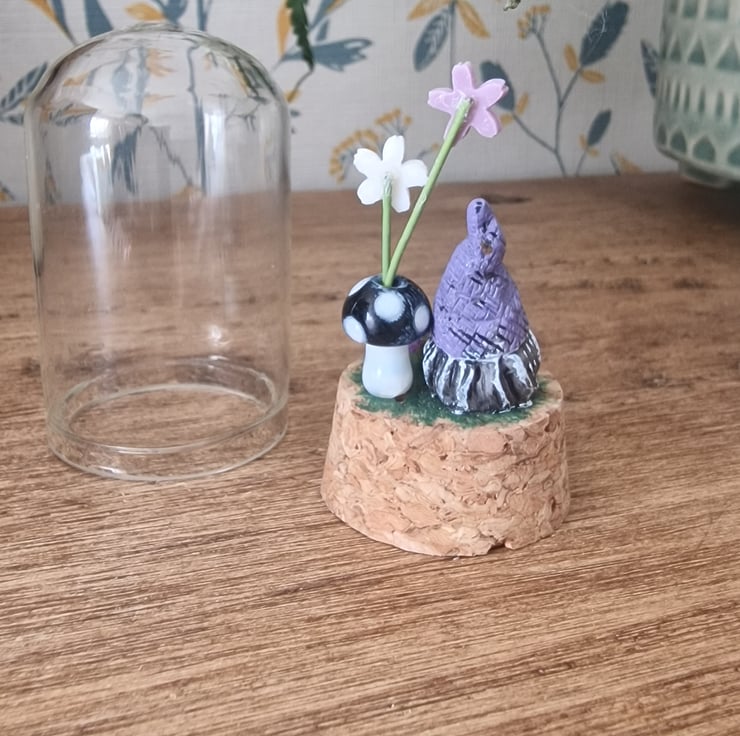 A cute glass dome featuring a pretty purple resin gnome & ceramic mushroom sprouting pretty flowers. All sitting in a magical garden....