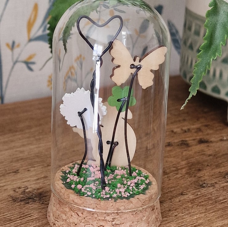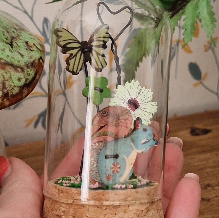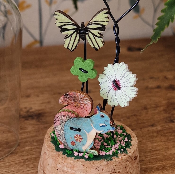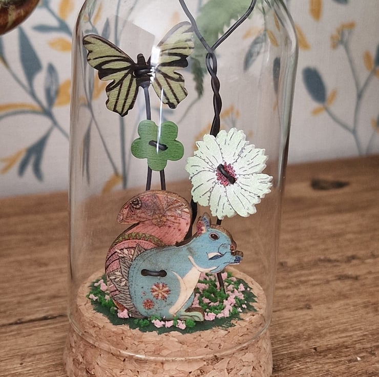 A cute glass dome featuring a adorable colourful Squirrel & sitting in a magical garden.