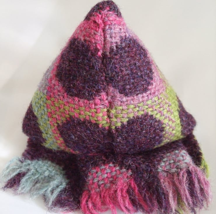An offcut from Melin Tregwynt in Pembrokeshire was just the right size for this little bird. The woven wool cloth has been made up into a polyhedron with button eyes and a felt beak. Polly measures ca 10 cm in each direction and can be put through a wool wash if required.