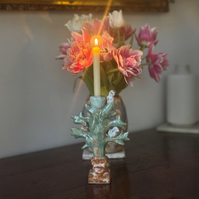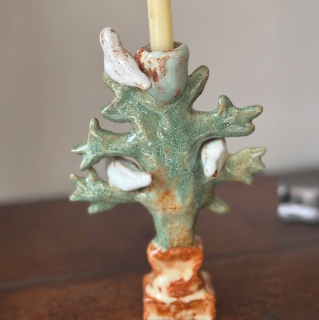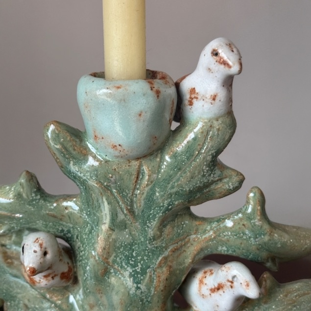Ceramic handmade tree with birds on branches candleholder.