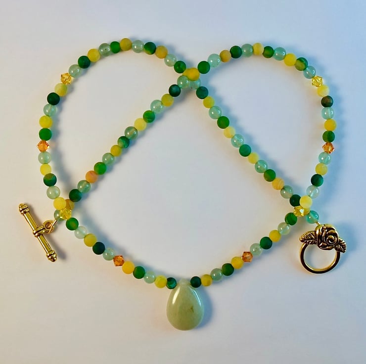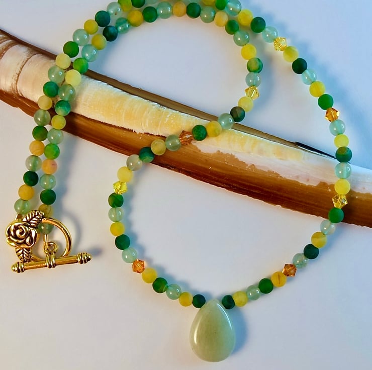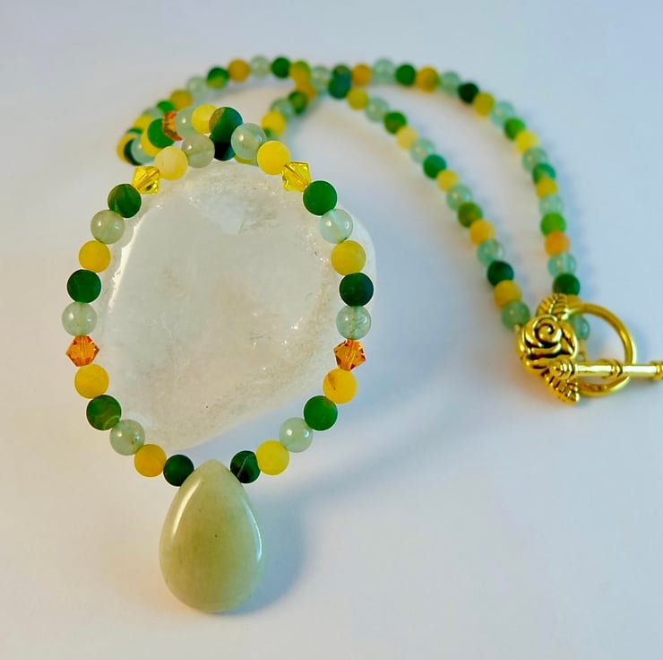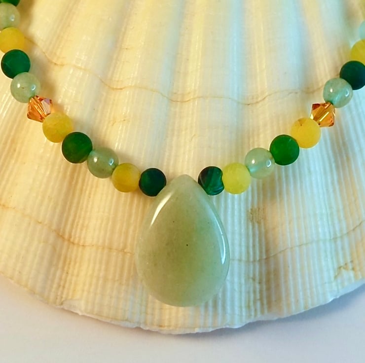 This necklace features a 13x18mm Green Aventurine teardrop pendant set between 4mm frosted Agate beads dyed in shades of green and yellow, natural green Aventurine and quality Austrian crystal bicones in 'topaz', 'light topaz' and 'citrine'.