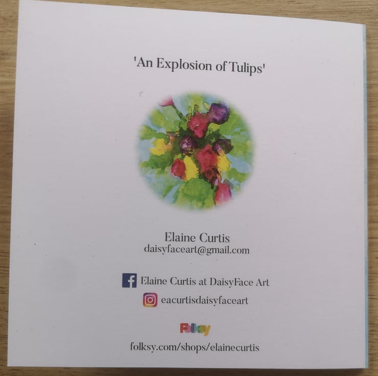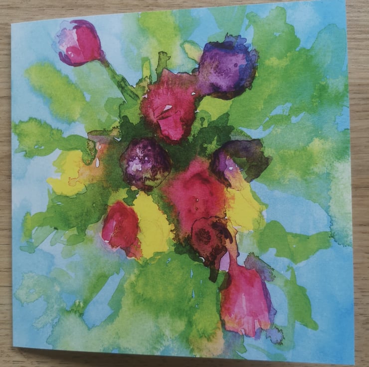 'An explosion of tulips' features a bird's eye view of beautiful bouquet of tulips painted in an abstract style. It is based on an original acrylic painting by Elaine Curtis.