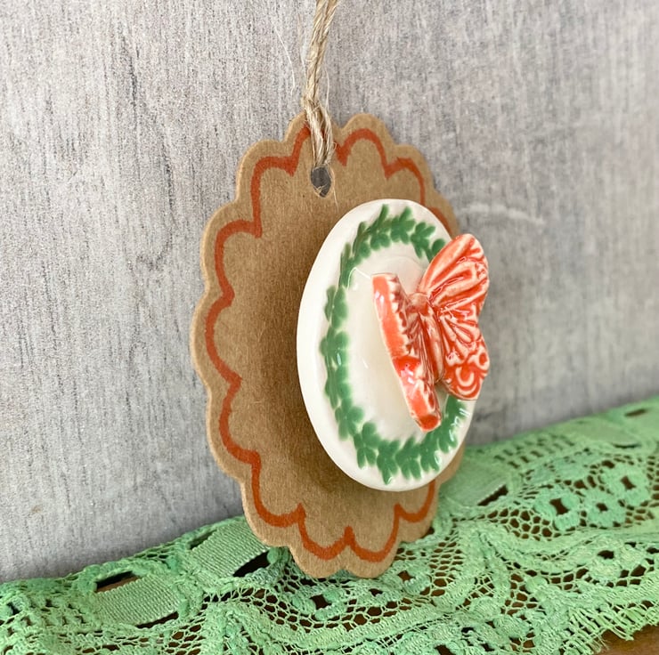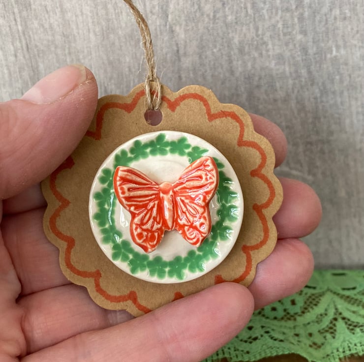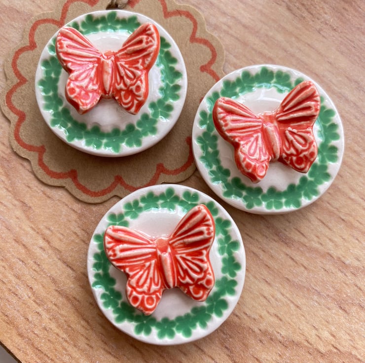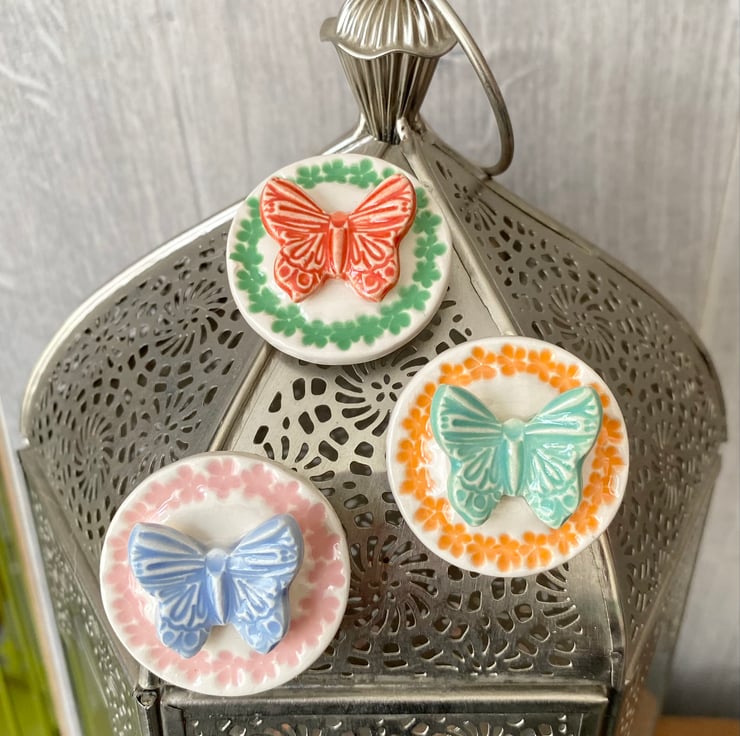 This little ceramic butterfly magnet is made from white earthenware clay and decorated with bright glazes. It has a strong magnet on the back and comes displayed on a brown tag. This has been fired in an electric pottery kiln, so it is nice and strong. It measures 3cm diameter.