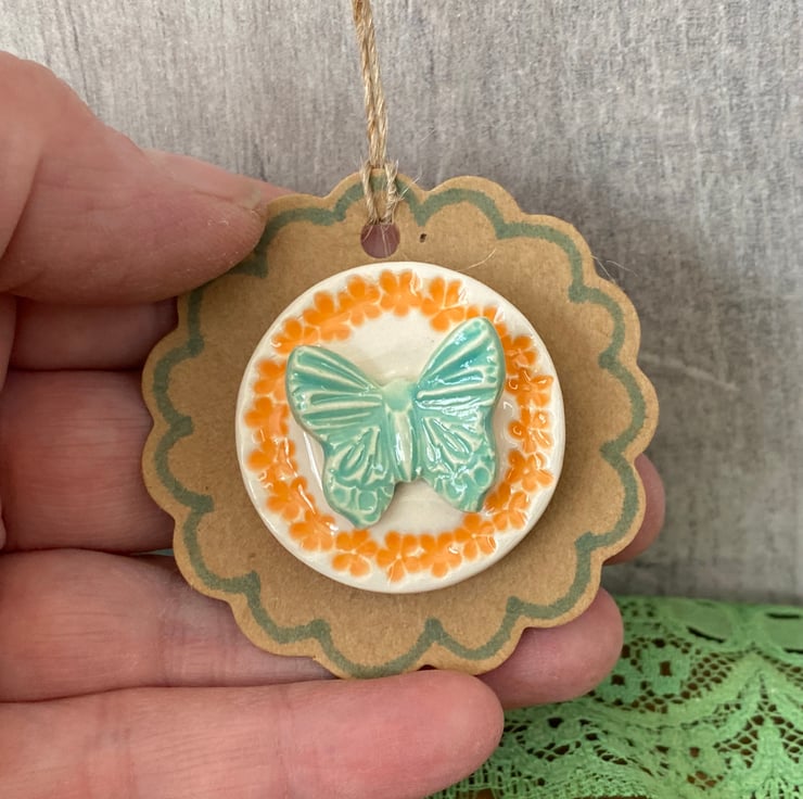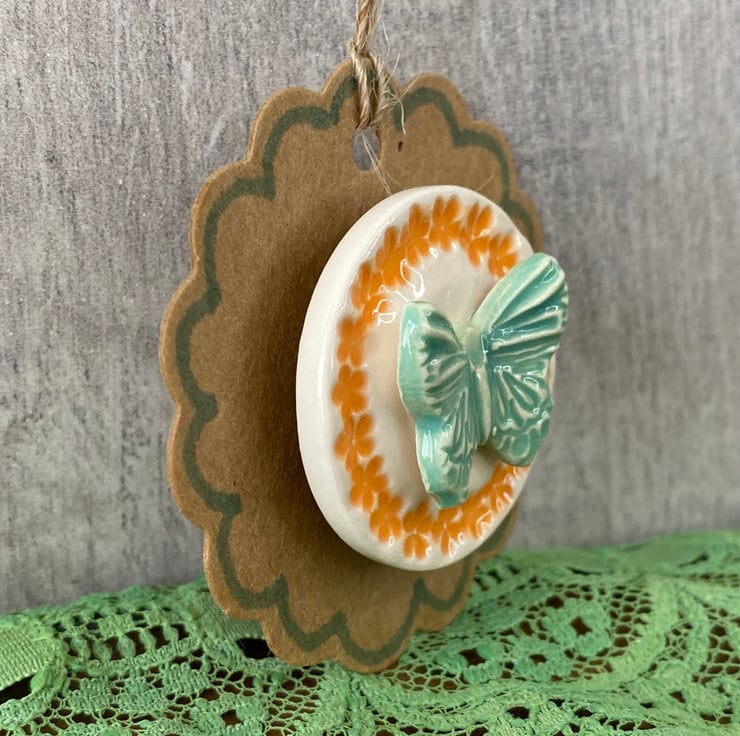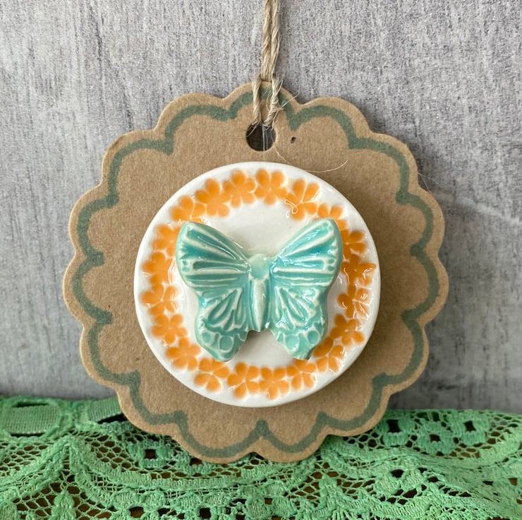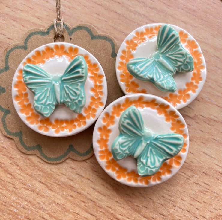 This little ceramic butterfly magnet is made from white earthenware clay and decorated with bright glazes. It has a strong magnet on the back and comes displayed on a brown tag. This has been fired in an electric pottery kiln, so it is nice and strong. It measures 3cm diameter.