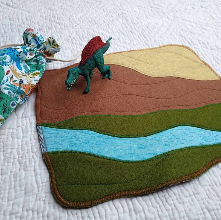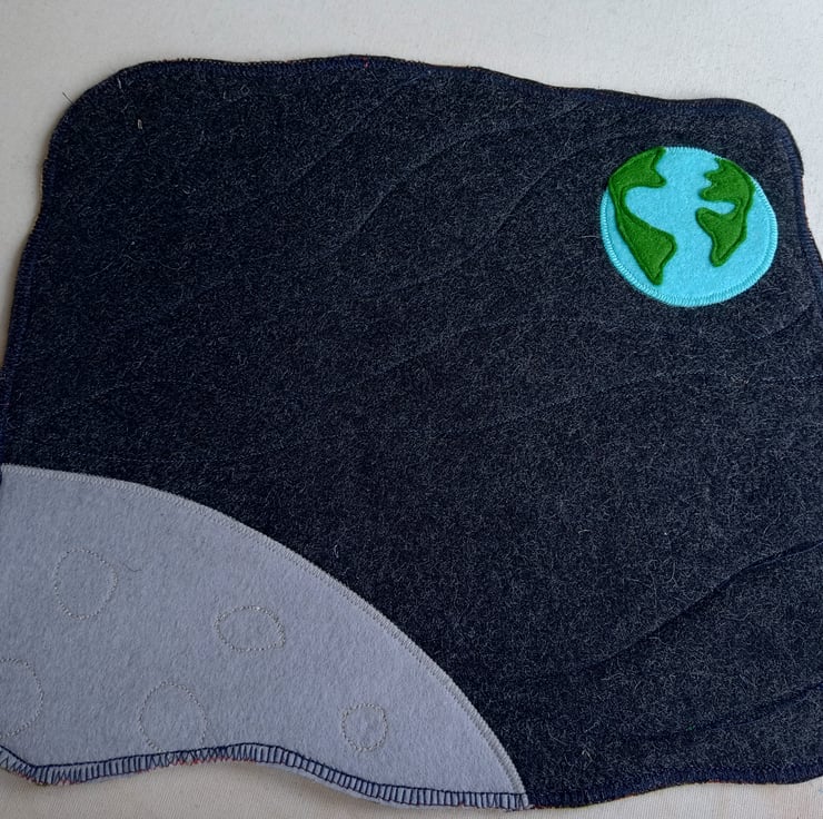 Dinosaurs in outer space? A felt playmat that's perfectly sized for small activity toy fun both at home and on holiday. Reversible so there are two scenes for both themed and open ended play. One side has a earthy land scene with river, sand and earth - perfect for dinosaurs, farms or safari animals. Or even an alien planet - which goes perfectly with the outer space theme on the reverse side.