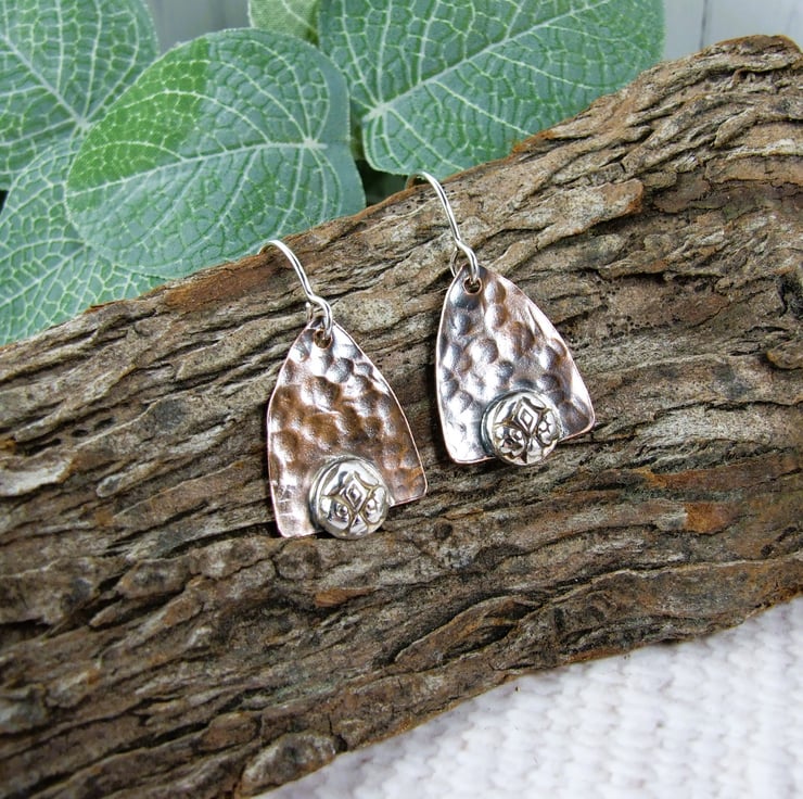 I have created the dropper shapes from copper sheet, hand cut and textured with a hammer. I then created the pebbles from molten silver, hammered them into a steel die to emboss the pattern and soldered these to the droppers. Fitted to sterling silver ear hooks