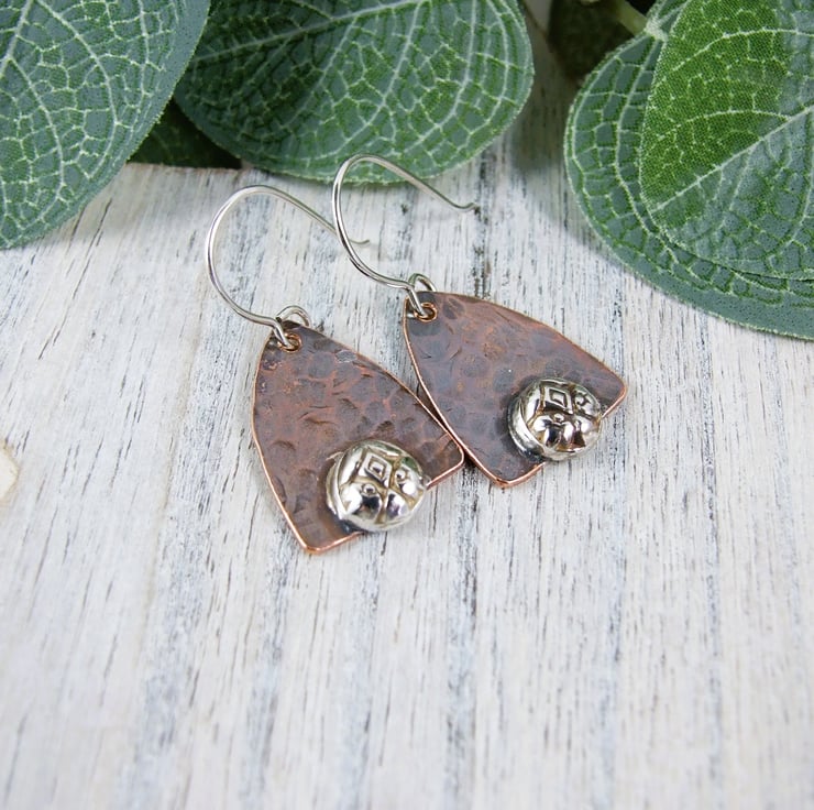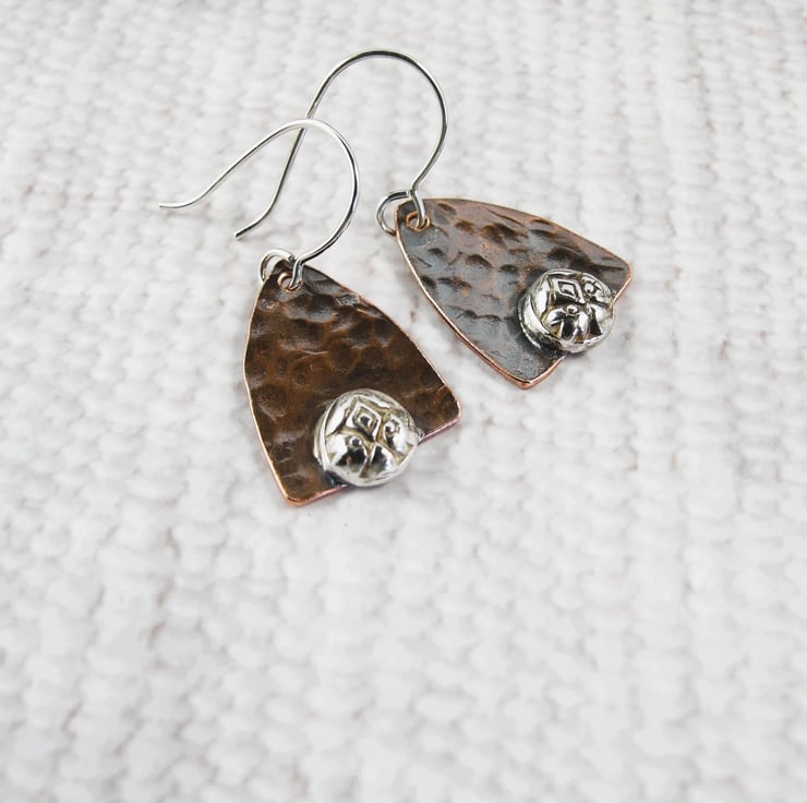 Copper dropper earrings. Arch shaped earrings with recycled silver patterned pebbles and sterling silver ear wires.