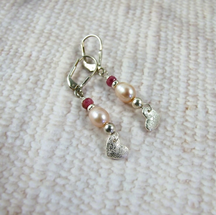 Sterling Silver Earrings with faceted ruby gemstone, champagne pearls and tiny sparkly silver hearts. Lever back ear wires.
