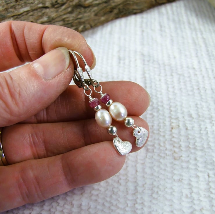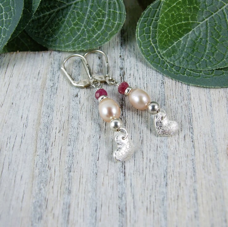 I began with the tiny hearts made from fine silver clay which has been kiln fired to form the charms. Once fired I have textured them to create a sparkly finish. These are paired with silver beads, a pretty champagne coloured pearl and a faceted ruby gemstone, all securely wire wrapped to the lever back ear wires. I have added the same sparkly texture to the front of the ear wires.