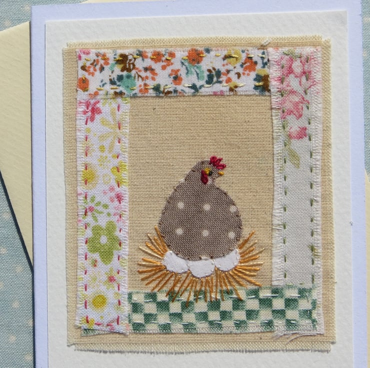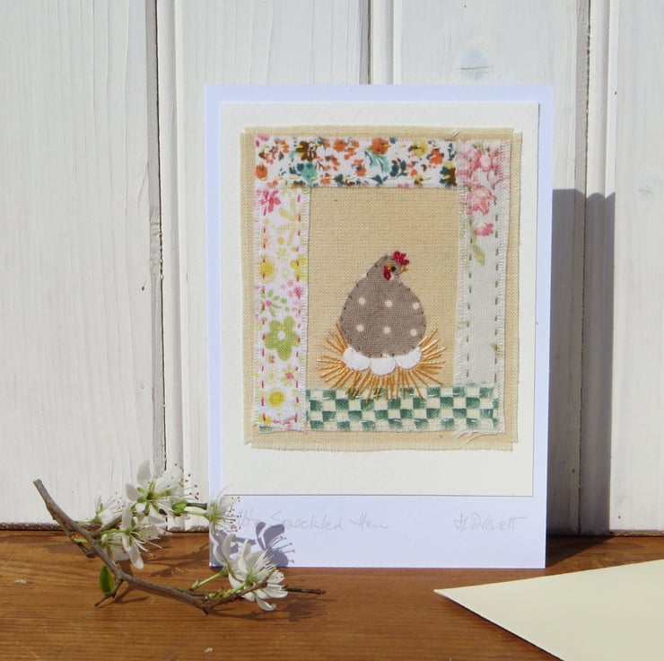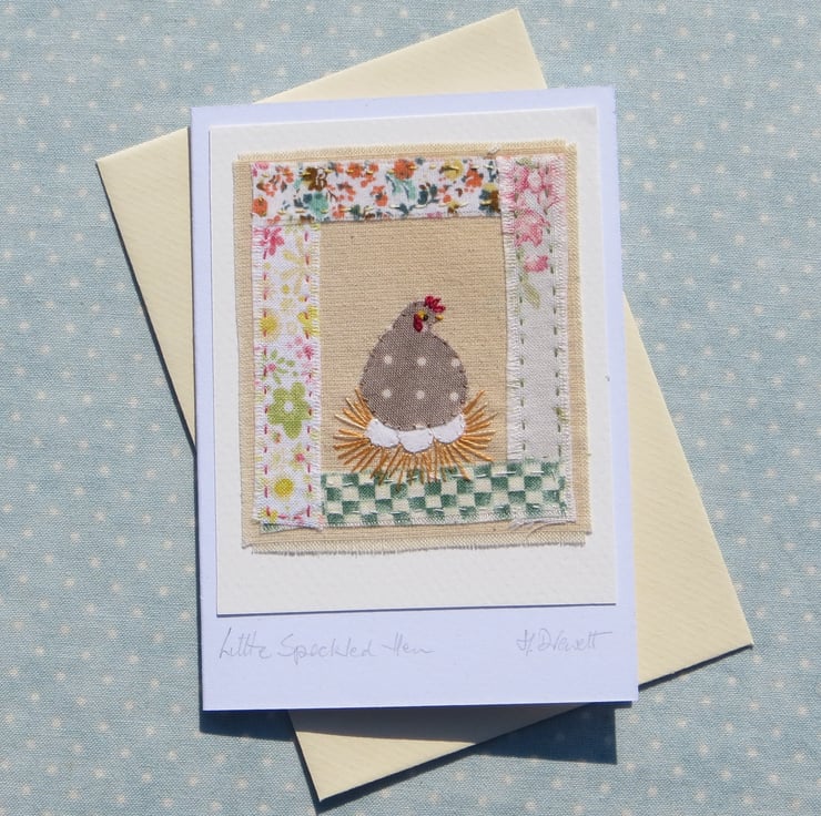 This is a small hand-made greeting card featuring a miniature hand-stitched applique made with pretty cotton fabric with intricate embroidered details. It is entitled 'Little Speckled Hen' and is a gift in itself as well as a card in which to write your message - definitely a card to keep! (perfect for the new poultry keeper!)
