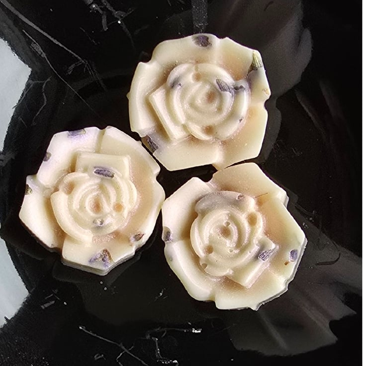 10 luxurious soy wax melt roses with dried flowers. Handcrafted with premium-quality soy wax and infused with Effete fragrance an exotic fragrance with top notes of lavender supported by heart notes of myrrh and heliotrope mixed with dried lavender and finished with a shimmering rose blush dusting if mica. Each champagne coloured melt offers a captivating and long-lasting floral scent experience (up to 60 hours per pack!). They are packed in compostable transparent bags and CLP labelled.