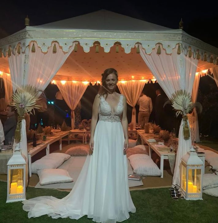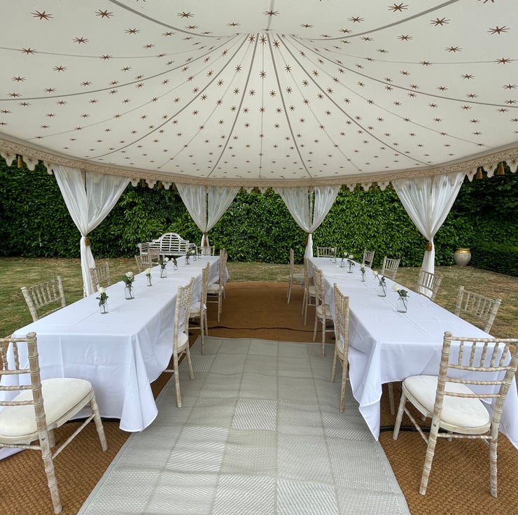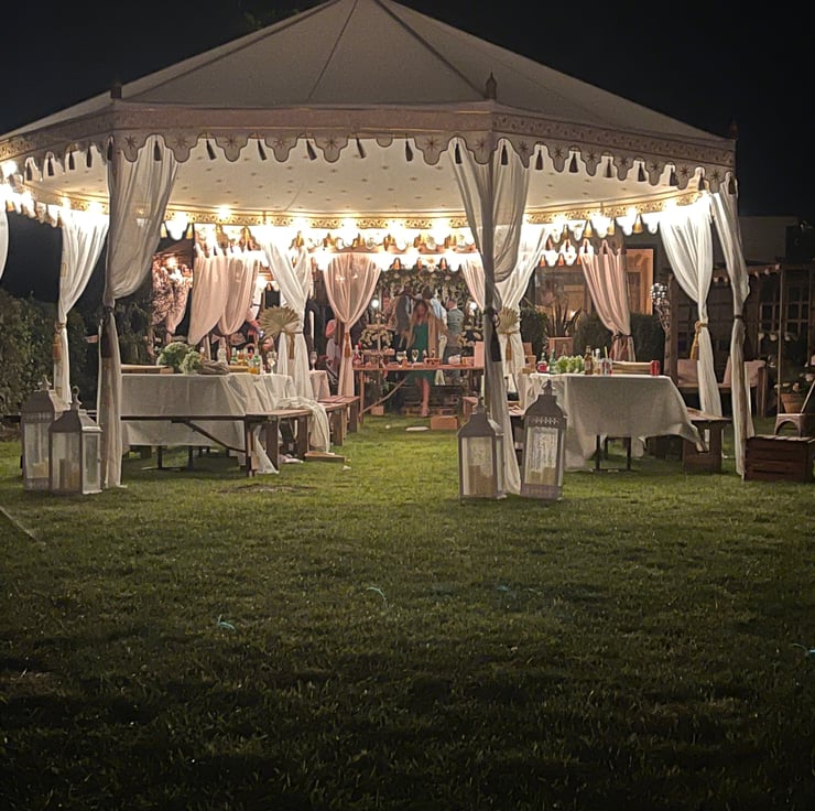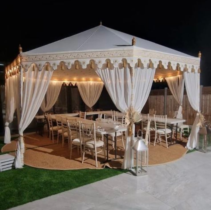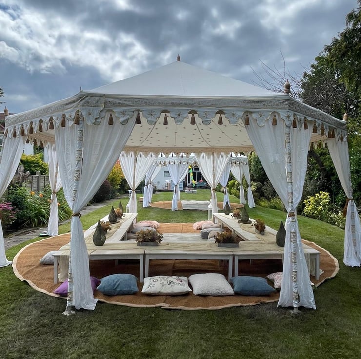 Our stunning Boho Pavilion Marquees are for hire. Creating an incredible space for outdoor entertaining. We are based in Surrey and cover most of the South East areas. Please get in touch with your postcode and date of your event and we will get back to you with availability within 24 hours.The price to hire the Marquee starts £445 for the 24 hour hire including setup (without any extras).