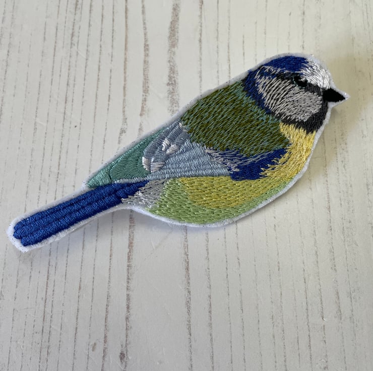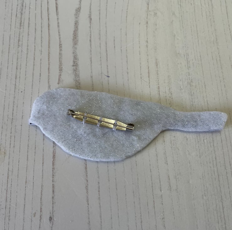 Machine Embroidered British garden bird the Great Tit, onto white felt with a hint of sparkle. This design is very intricate and so pretty on a lapel or add to a fabric bag. Brooch bar on the back, backed with white glitter felt. Mesures 4.5" X 1.5".