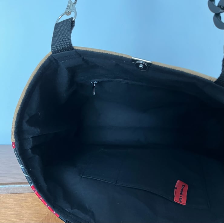 . Zipped pocket, cell phone pocket and pen pocket all inside of bag