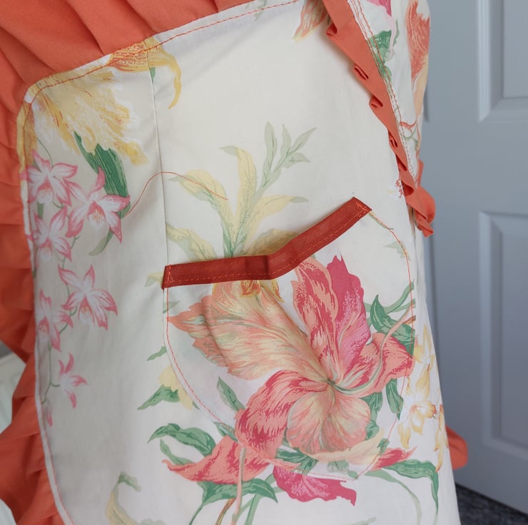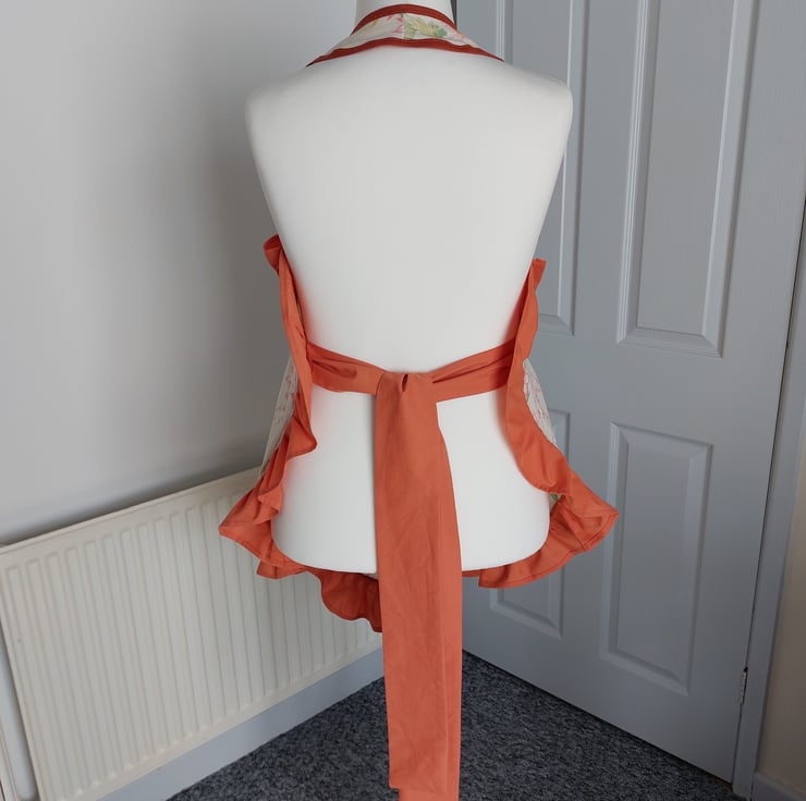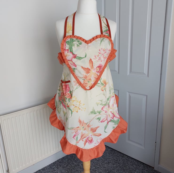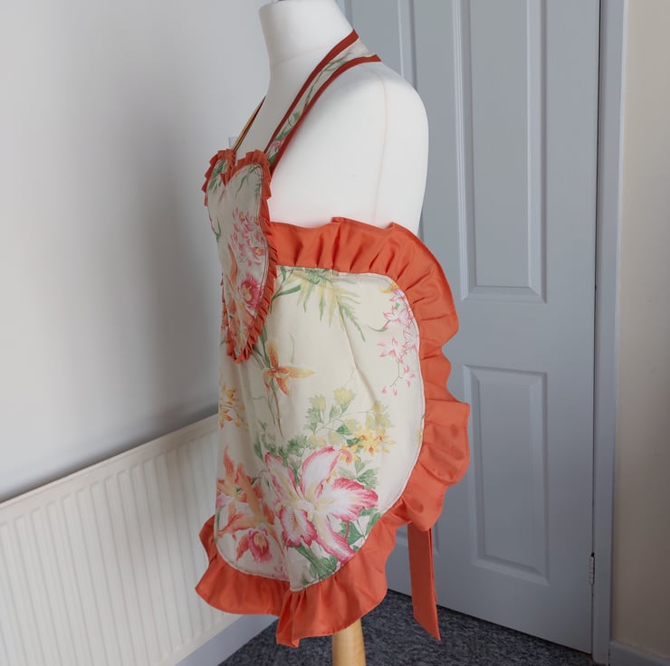 1940s style Sweetheart Apron, upcycled using a vintage orchid floral cotton fabric and terracotta bias tape. Ruffle and ties are made using a terracotta polycotton sheet. This would fit up to a uk size 18.