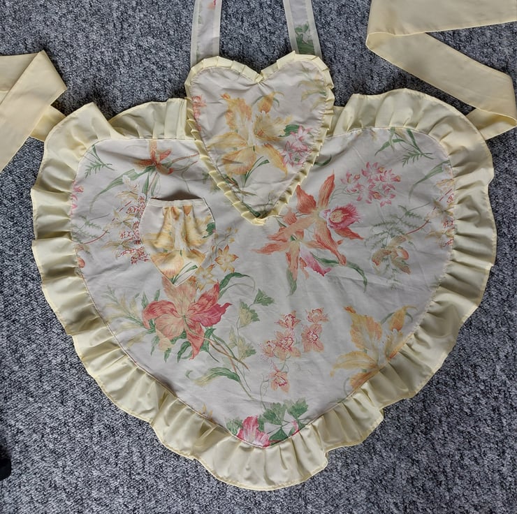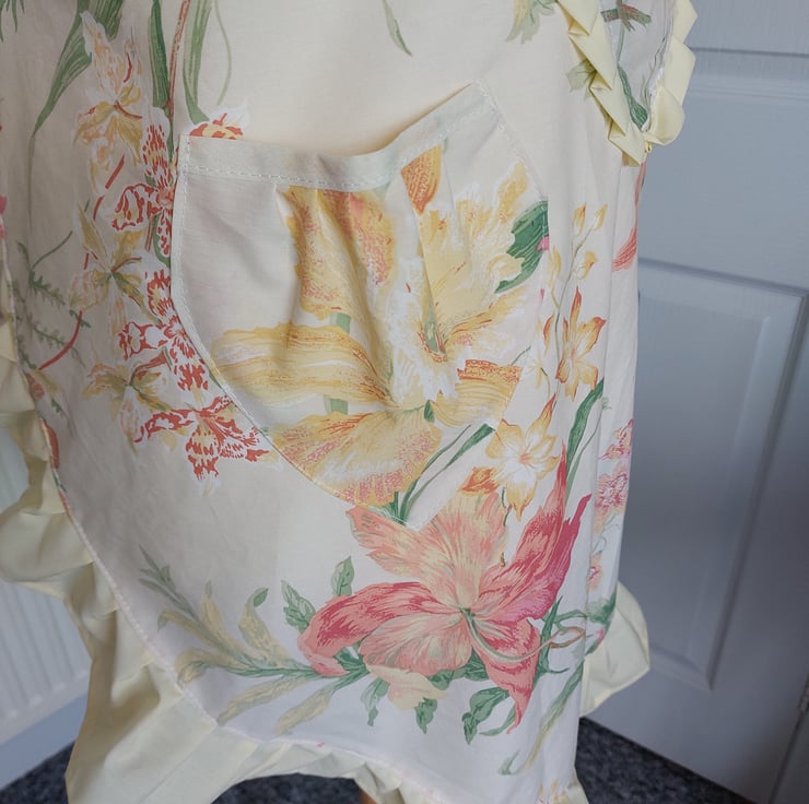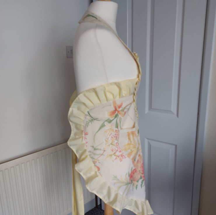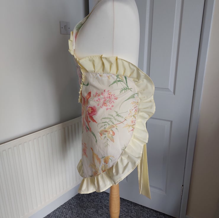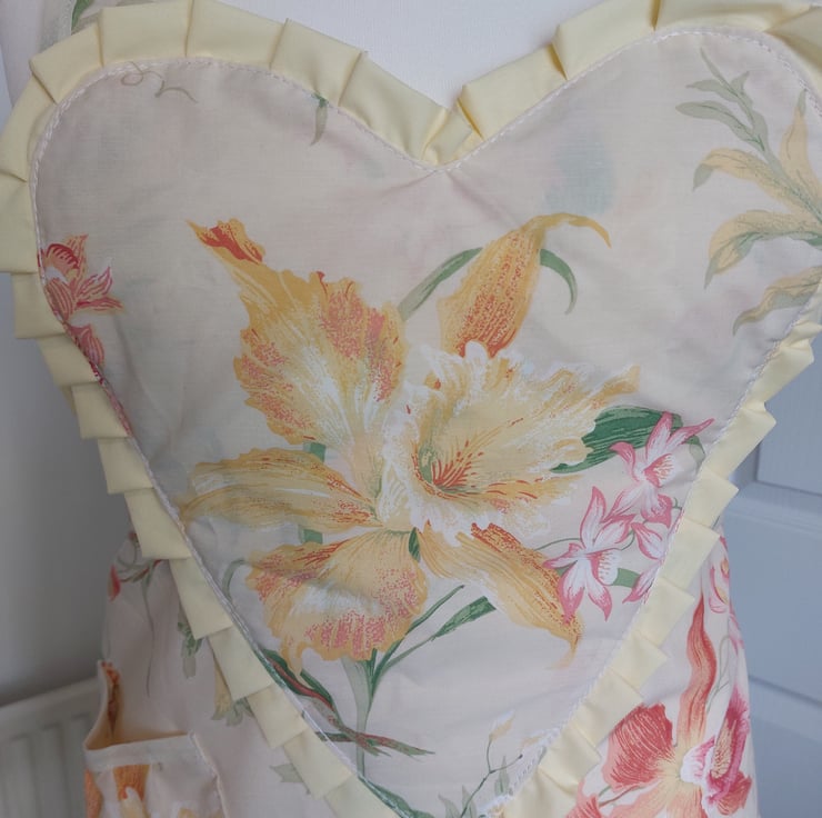 1940s style Sweetheart Apron, upcycled using a vintage orchid and daffodil floral cotton fabric and cream bias tape. Ruffle and ties are made using a lemon polycotton sheet. This would fit up to a uk size 18.
