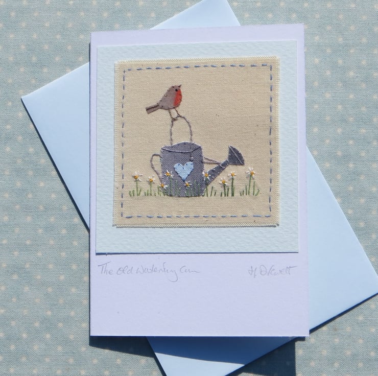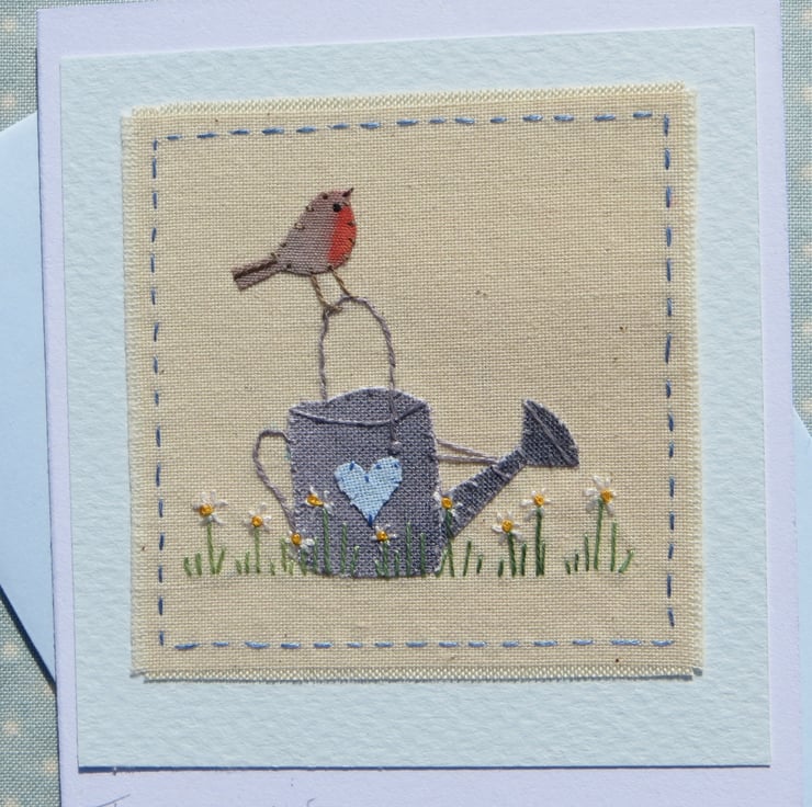 A hand-stitched textile miniature mounted onto greeting card, a gift in itself to keep as well as a card in which to write your message. I have cut the tiny applique watering can by hand and stitched it into position with the addition of embroidered details. A little robin perches on the handle and I have embroidered daisy flowers. I have used my own hand dyed recycled cottons to make this miniature textile.