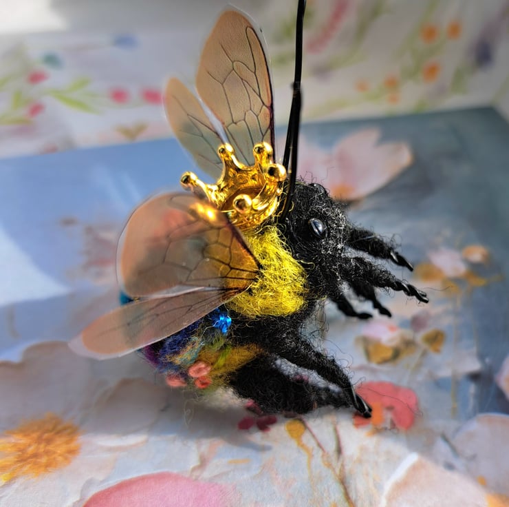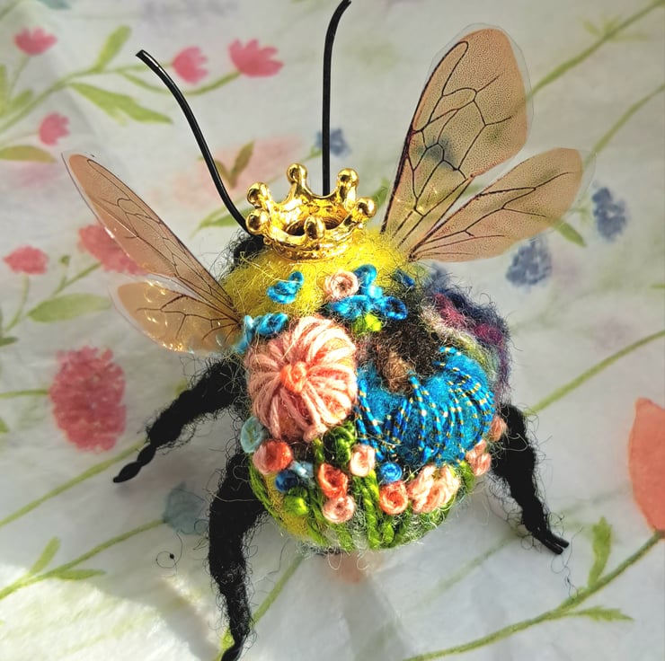 Needle felted and embroidered queen bee,,complete with tiny crown. measures approx 3 cm long by 5cm wide .Your bee will come with a fine gold hanging thread ,which can be snipped off if not required,Gift box included.This is actual bee you will purchase.