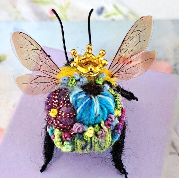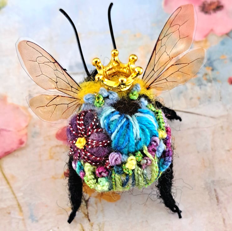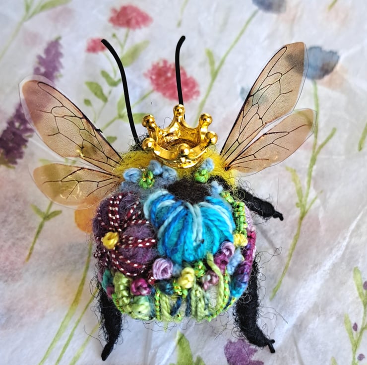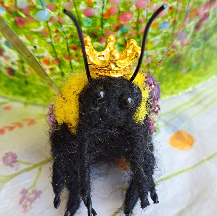 Needle felted and embroidered queenr bee, measures approx 3 cm long by 5cm wide .She has a little crown attached to her head.Your bee will come with a fine gold hanging thread ,which can be snipped off if not required,Gift box included.This is actual bee you can purchase.