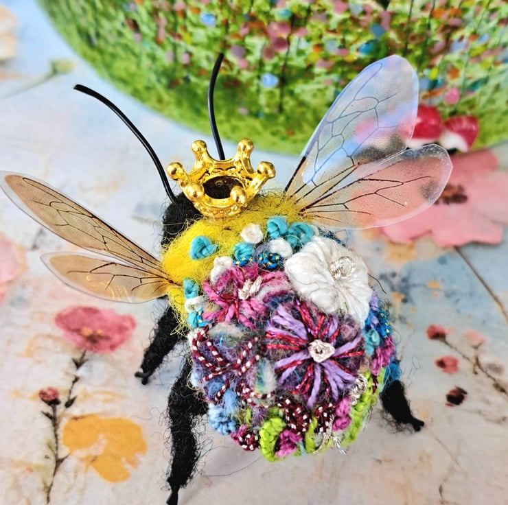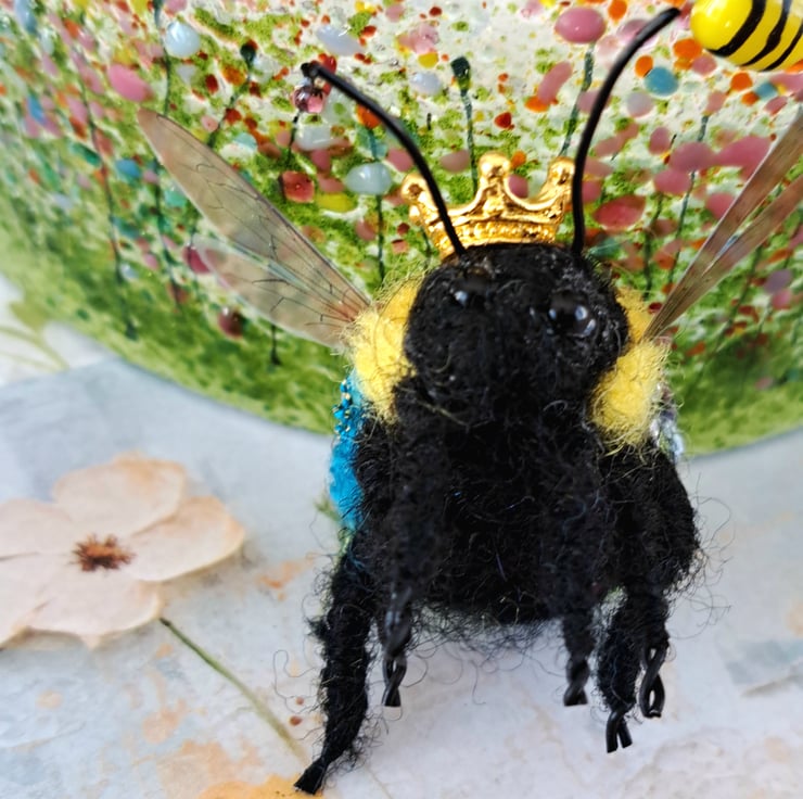 Needle felted and embroidered queen bee, measures approx 3 cm long by 5cm wide .She has a little crown attached to her head.Your bee will come with a fine gold hanging thread ,which can be snipped off if not required,Gift box included.This is actual bee you can purchase.
