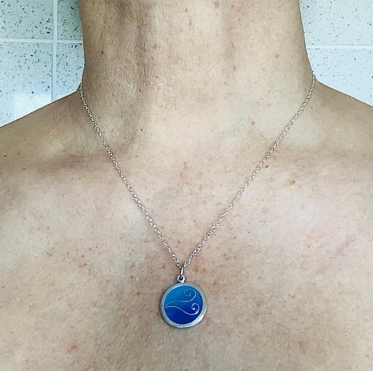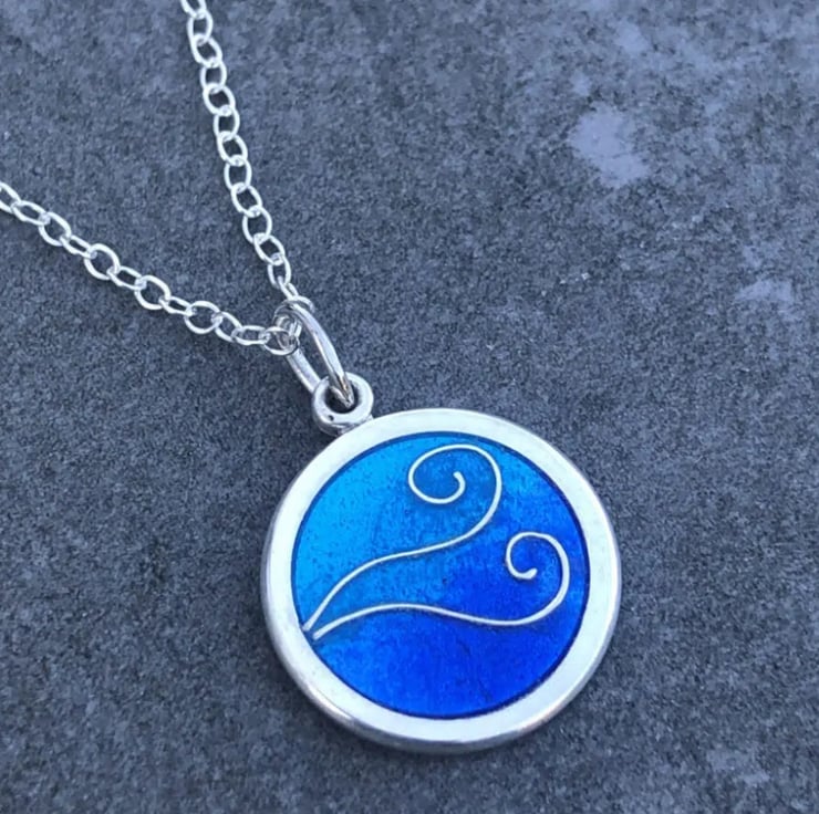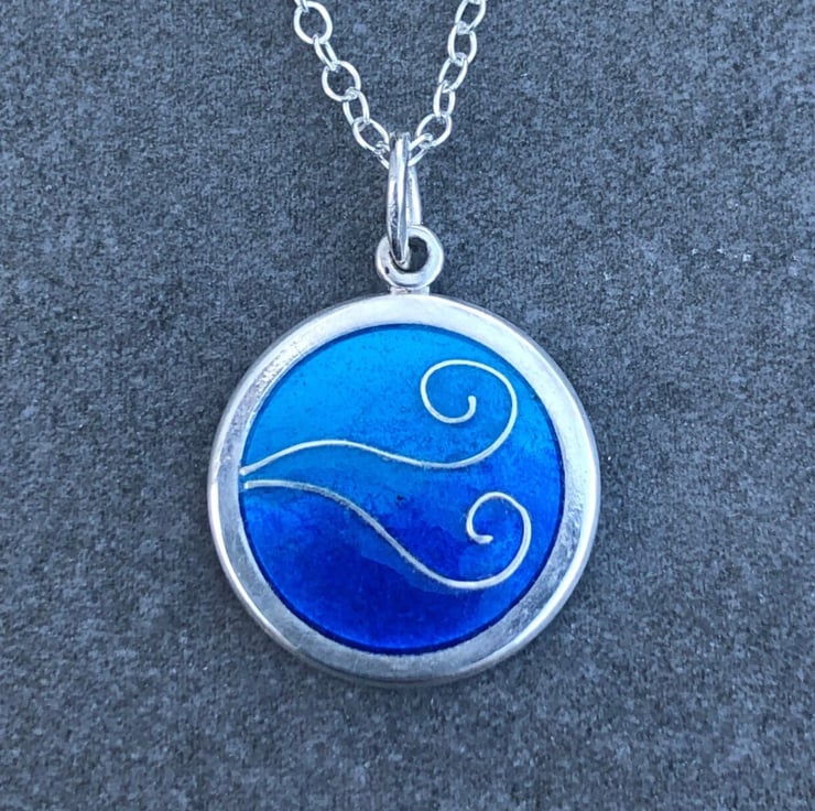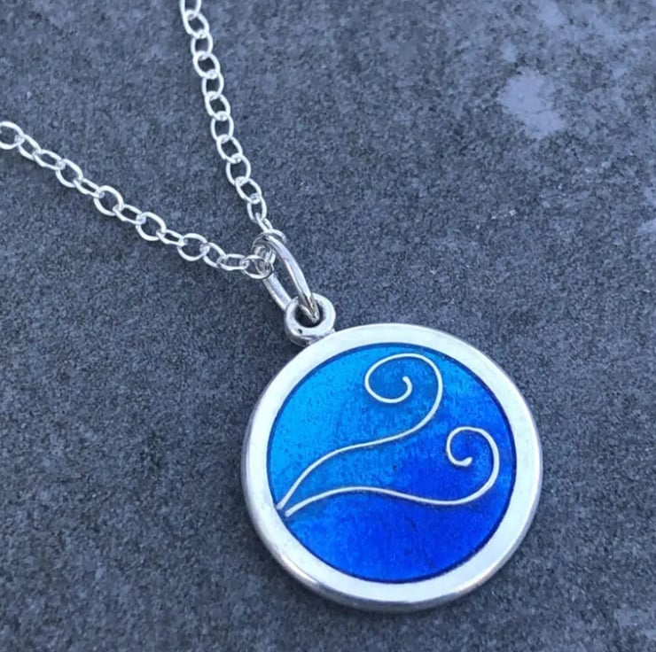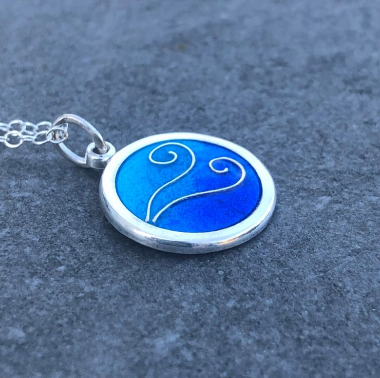 This enamel pendant is made from Sterling Silver, Fine Silver and blue enamels and inspired by looking through port holes at beautiful Mediterranean seas. Beautiful blue enamels and fine silver wave detail make this a vibrant piece. The pendant has a silver border circumference and the diameter of the pendant is approx; 1.5 cm. The pendant hangs on an 18” Sterling Silver chain. Please let me know if you need a different length chain.