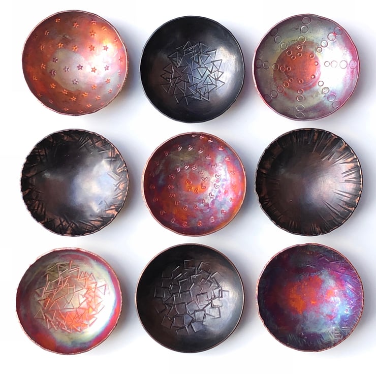 These tiny copper bowls are hand stamped and hammered, then formed from flat sheet into a bowl form. The colour is achieved with heat and is completely unique every time.