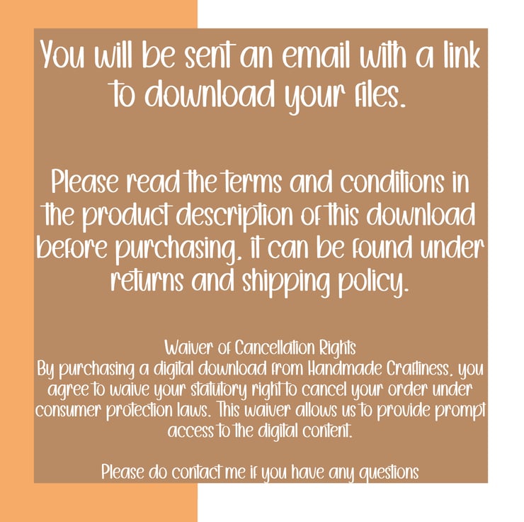 No Refunds for Digital Downloads Refund Policy for Digital Downloads Acceptance of Terms By completing your purchase, you acknowledge and accept this refund policy. At Handmade Craftiness, we are committed to providing high-quality digital products. Please read our refund policy carefully before making a purchase: Waiver of Cancellation Rights By purchasing a digital download from Handmade Craftiness, you agree to waive your statutory right to cancel your order under consumer protection laws. This waiver allows us to provide prompt access to the digital content. No Refunds After Download For digital downloads, consumers are required to waive their cancellation rights before the digital content can be provided. This means that once a customer (i.e., the consumer) has downloaded the content, they have given up their consumer rights to a refund. This policy aligns with consumer law for digital goods, ensuring the protection of intellectual property and preventing unauthorized distribution. Cancelling a Digital Download Under the Consumer Contracts Regulations 2013, digital downloads are neither goods nor services, meaning the law is a little different. If you want to download something within 14 days of buying it (known as the 'cooling-off’ period), you must give your consent to waive the 14-day cooling-off period. If you do not give your consent, the 14-day cooling-off period still applies. However, you will not be able to download your digital content until this period has ended. This policy exists to prevent customers from changing their minds after downloading the content. As you are being sent a link via email to download after purchase this will count as downloading the content as you will have access to download the files from the email. Eligibility for Refunds Refunds may only be issued under exceptional circumstances, such as: The digital content is proven to be defective or incomplete. An error on our part (e.g., duplicate billing). Contact Us If you believe you are eligible for a refund due to one of the exceptional circumstances above, please contact us at orders@handmadecraftiness.co.uk with your order details, a description of the issue, and proof of purchase. Our team will review your request and respond within 7 business days. For further inquiries, please contact us at orders@handmadecraftiness.co.uk. ------------------------------------------------------------------------------------------------------------------------------------------------------------- Ownership and Usage: All artwork within this shop is the exclusive property of Handmadecraftiness. You are expressly prohibited from reproducing, altering, redistributing, reselling, or claiming ownership of any digital item from this store. However, you are permitted to incorporate products from this store into your own physical handmade items for sale as a hobbyist. TERMS OF USE 1. You may print and use these items in a tangible journal/scrapbook/craft project etc. 2. You MAY NOT sell or share these files. 3. You MAY NOT reproduce/alter/redistribute our designs as a digital or physical item. 4. You MAY NOT sell or manipulate these files for resale purposes. 5. You MAY NOT share these files individually or as kits.