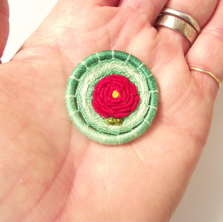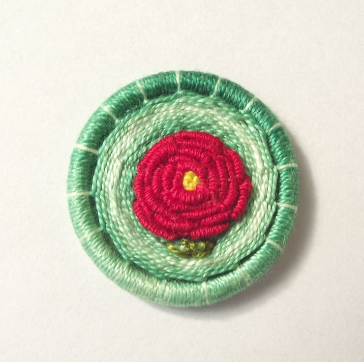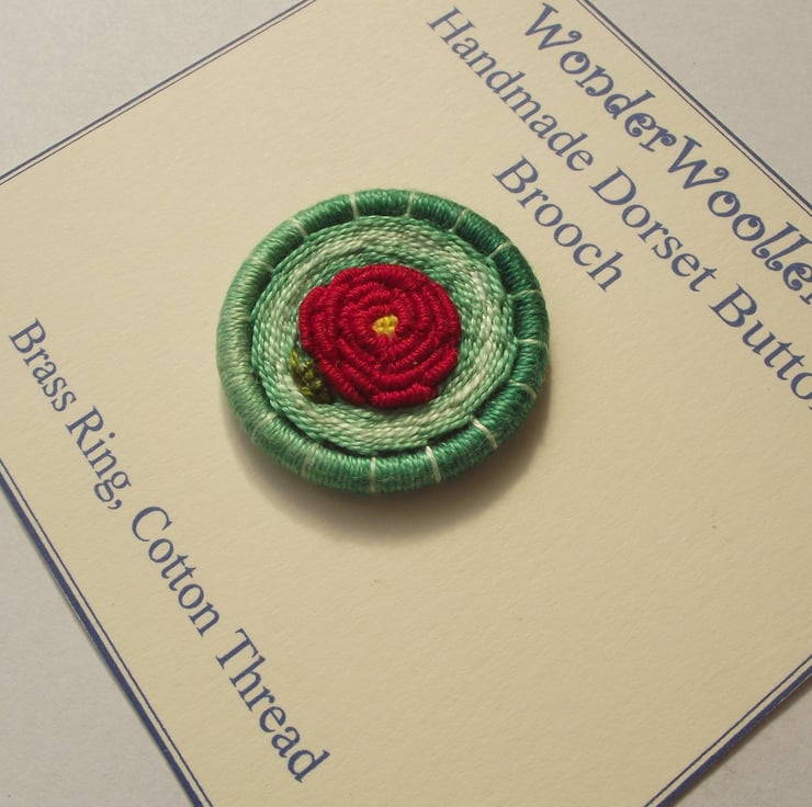 This listing is for a 3.5cm Dorset button brooch or pin. I made this by using various techniques of working cotton thread around a brass ring, forming a red rose. There are also two green leaves. This is all set on a green background. I have attached a silver plated brooch back for easy attachment to clothing, bags etc.