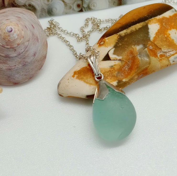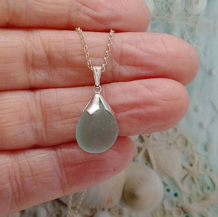 Aqua Blue/green seaham seaglass pendant set in a sterling silver bell cap with bail suspended from an 18 inch sterling silver chain.