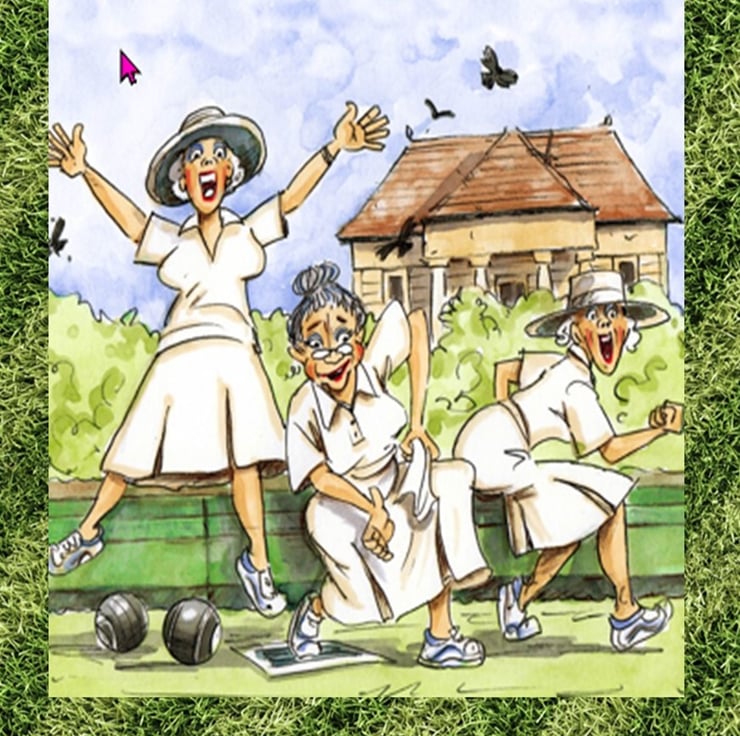 Celebrate the fun of growing older with this cheeky birthday card fea-turing the “Bowling Biddies” – a trio of lively senior ladies mid-lawn bowls match! Dressed in classic white bowling outfits and wide-brimmed hats, one woman throws her arms in the air with joy, another leans into her throw with a mischievous grin, and the third pumps her fist in celebration. The cartoon scene is set against a lush green bowl-ing lawn with a rustic clubhouse and fluttering birds in the back-ground – full of energy, laughter, and friendship.