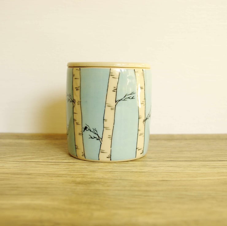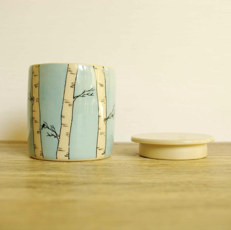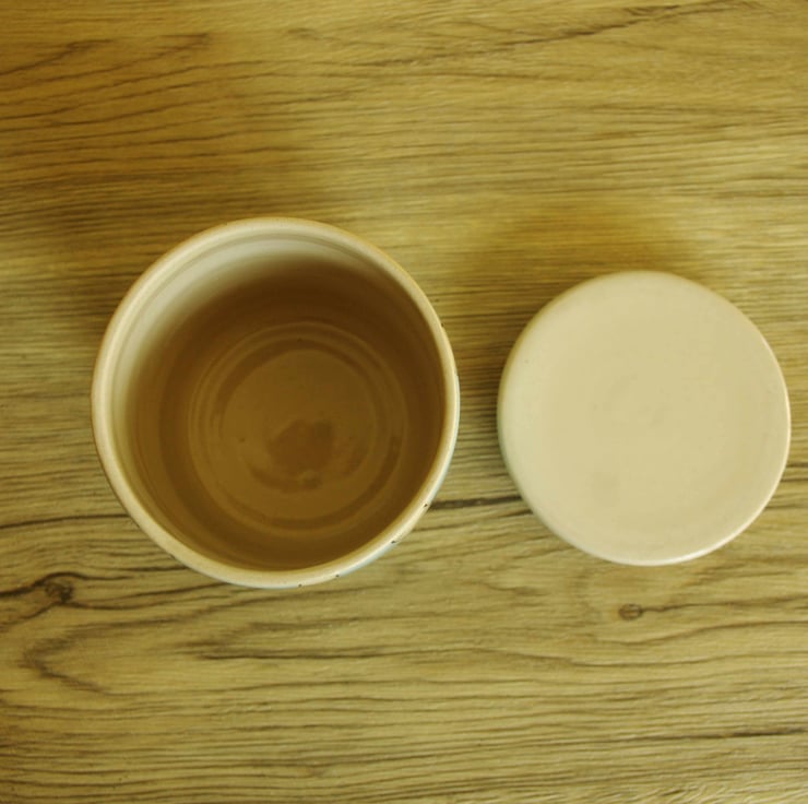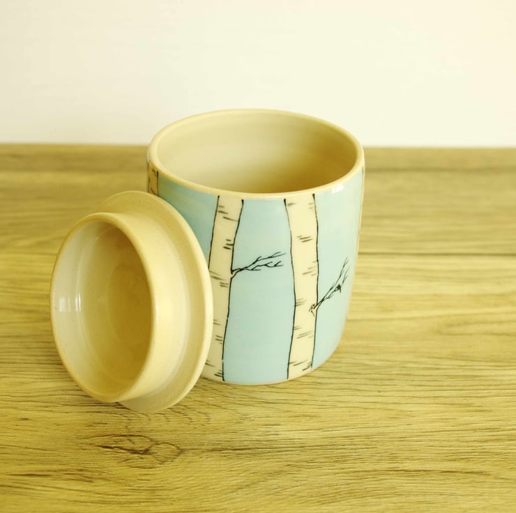 These lidded storage jars are hand-thrown on a wheel using earthstone clay and glazes fired in an electric kiln.