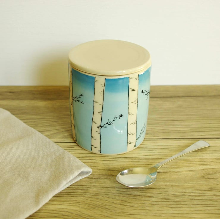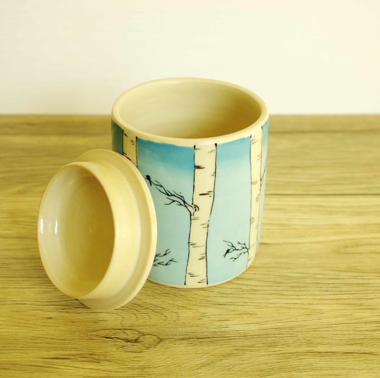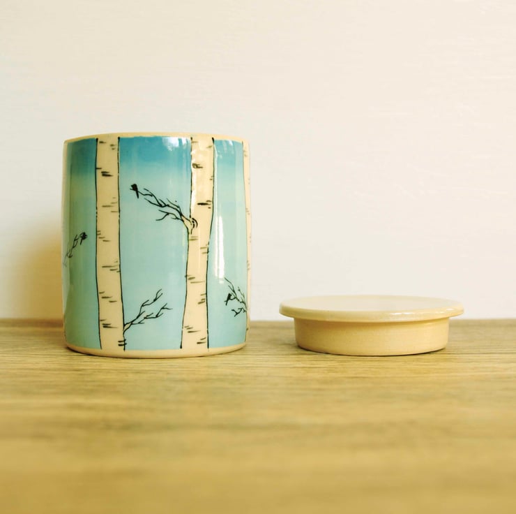 These lidded storage jars are hand-thrown on a wheel using earthstone clay and glazes fired in an electric kiln.