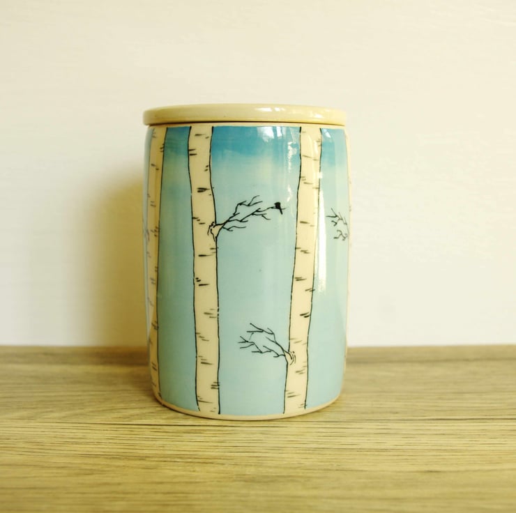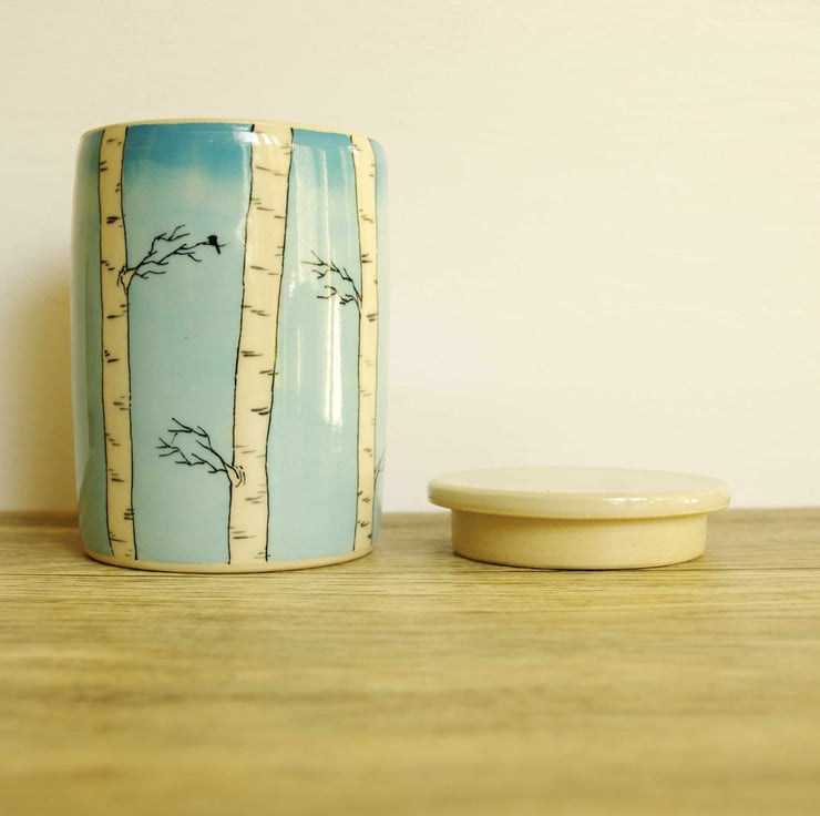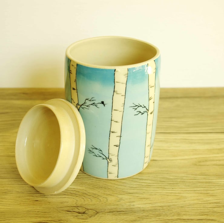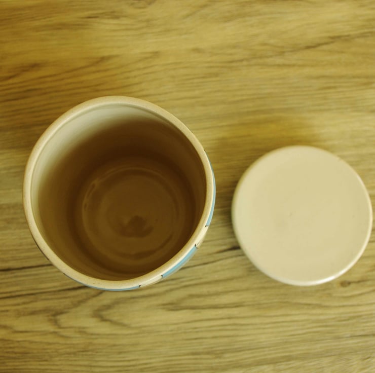 These lidded storage jars are hand-thrown on a wheel using earthstone clay and glazes fired in an electric kiln.