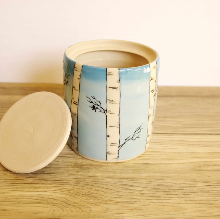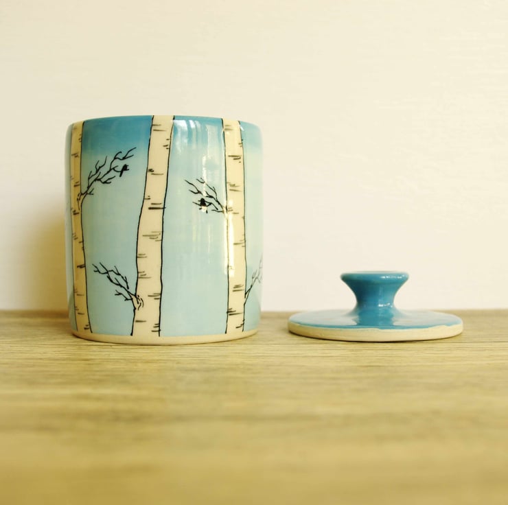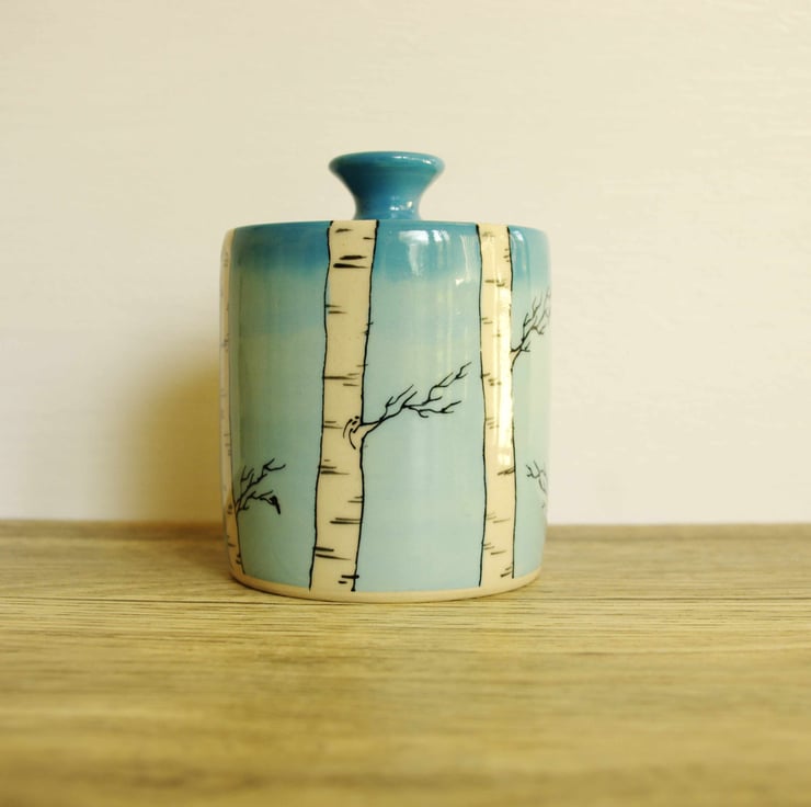 These lidded storage jars are hand-thrown on a wheel using earthstone clay and glazes fired in an electric kiln.
