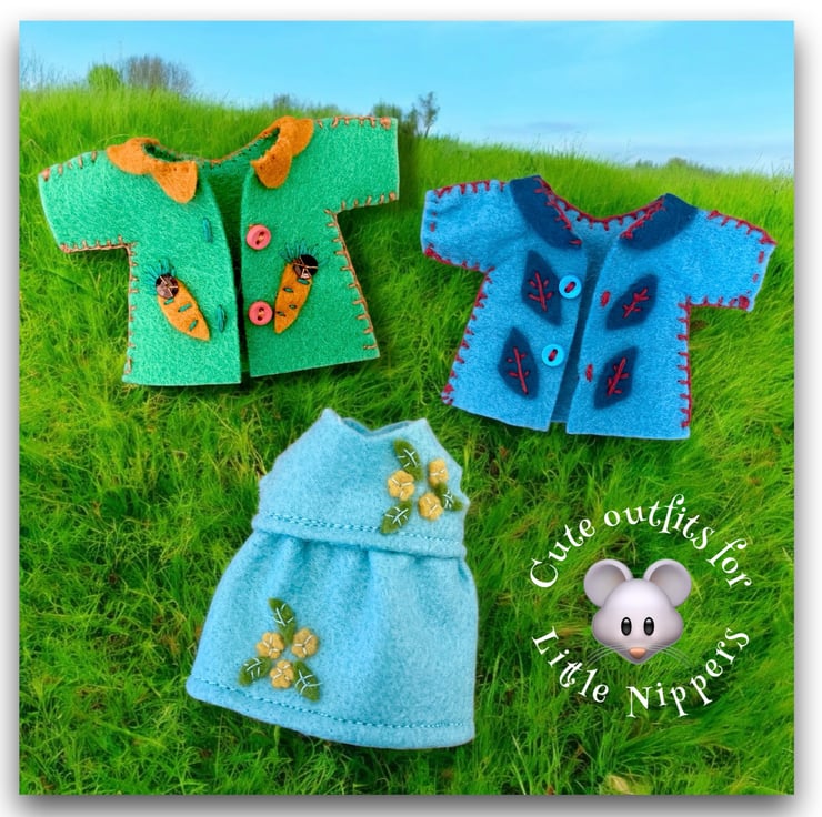 A sweet little green felt coats, embroidered with tiny carrots, made specially to fit the Little Nippers. The coat is finished off with a collar and two little buttons.