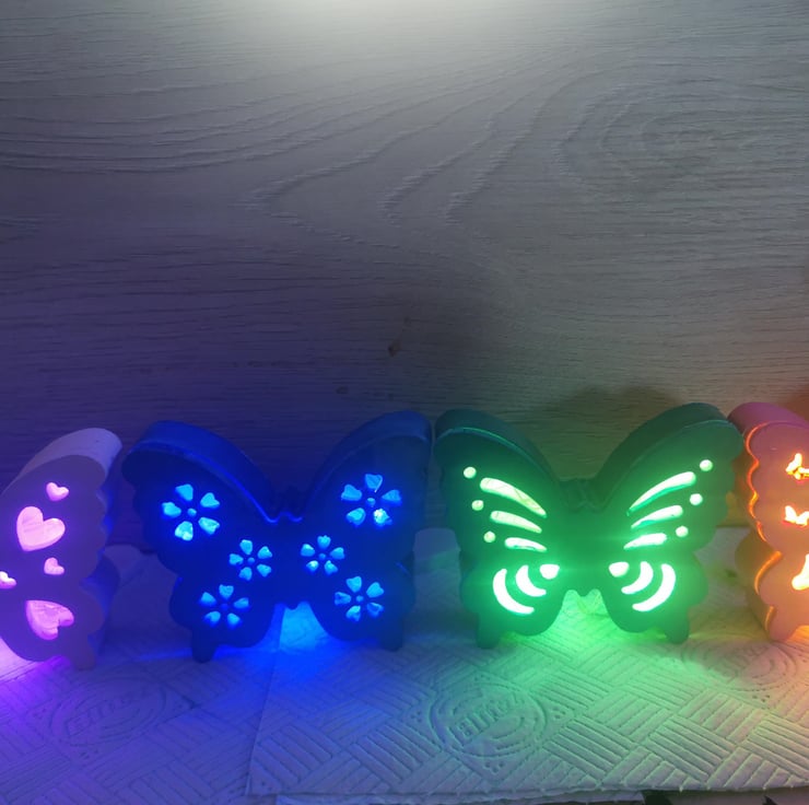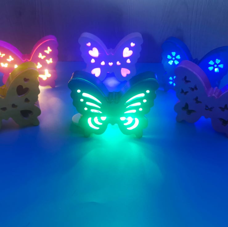 These wonderful Nightlights are handmade and Hand Painted to order in 4 unique styles and 6 vibrant colors. Choose from 4 soothing light colors to create the perfect ambiance. These battery-operated nightlights come with a spare battery, ensuring long-lasting illumination for any space. Illuminate your nights with elegance! Ideal for comfort lighting in a child's room.