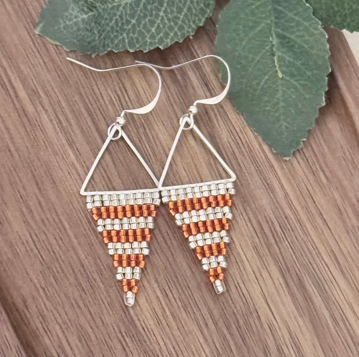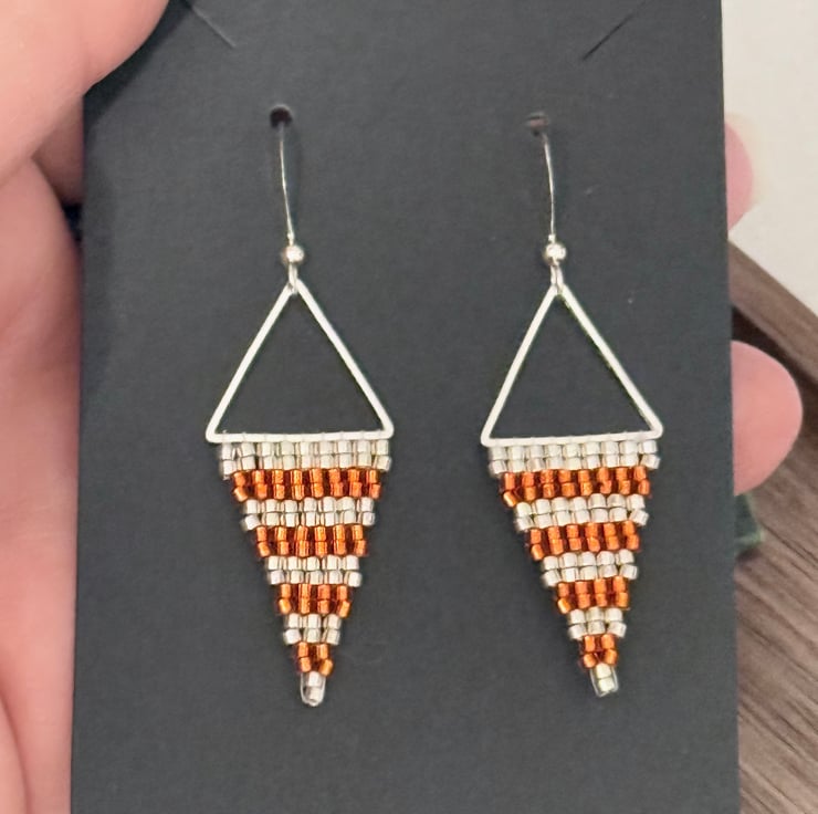 The beads have been hand-woven onto a silver tone triangle, then into double rows of alternating orange and silver to form a long triangle shape.