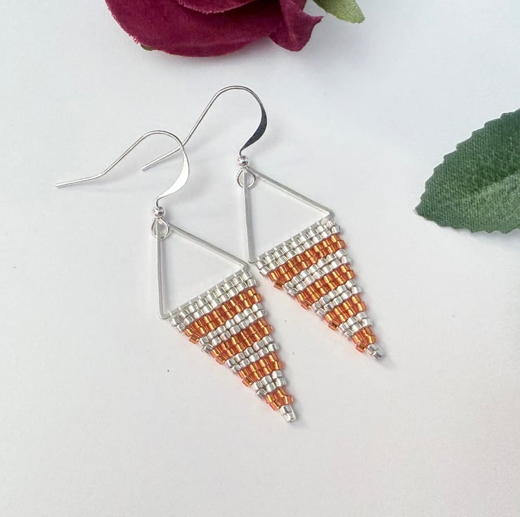 These colourful lightweight beaded earrings have been handmade with small Miyuki glass beads in vivid orange and silver.