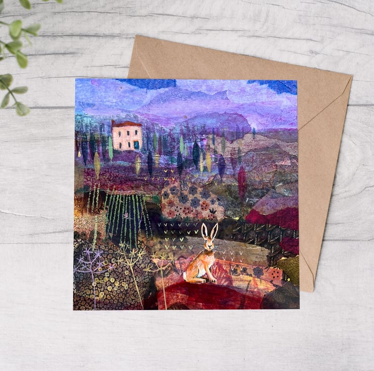 This blank card is printed from my whimsical mixed media painting 'Hare Stare'. A landscape of patchwork fields, purple skies and a quirky hare.