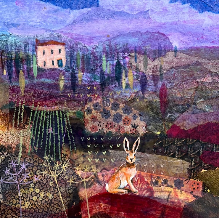 I often see a landscape as patterned shapes making up a patchwork blanket. I couldn't resist adding a quirky hare to my painting!