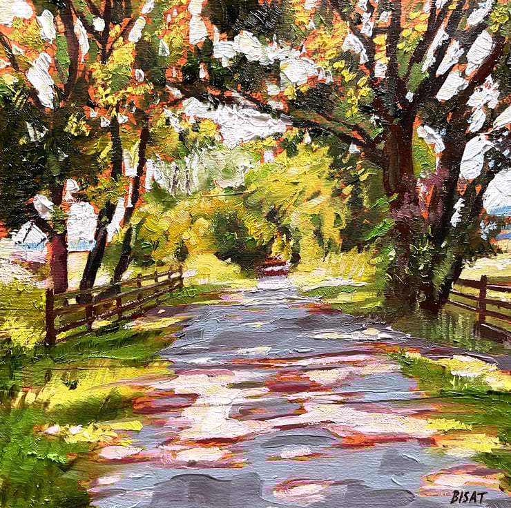 I frequently walk the Southwell trail with our dog. On this particular occasion, I was struck by the quality of the light filtering through the trees and I wanted to try and capture the brightness and warmth of the day in my painting. Locals will recognise that this view is where the trail crosses the river Greet.