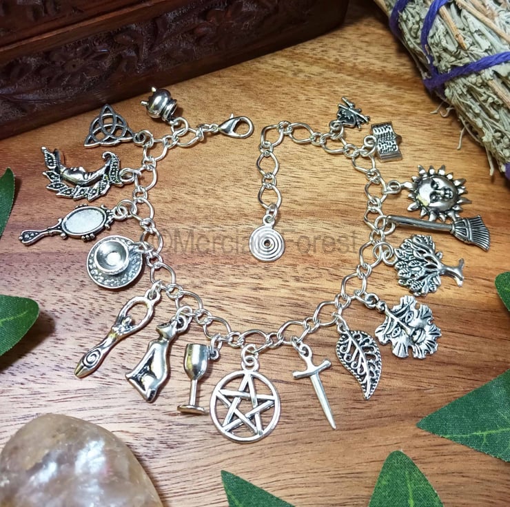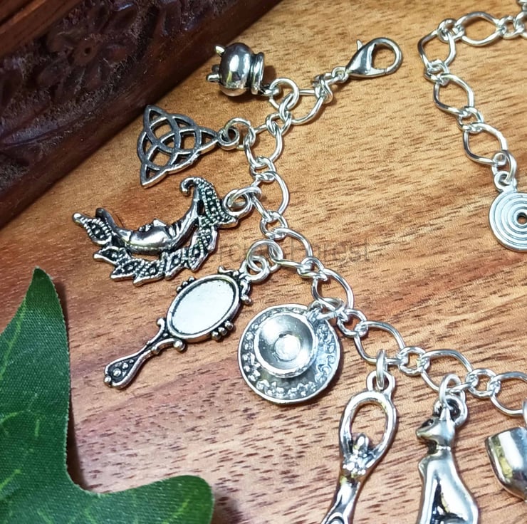 Hand crafted using quality silver plated chain, the bracelet features a lovely selection of Tibetan Silver charms all associated with Witchcraft. From Altar and Divination Tools to the Goddess and Green Man this bracelet has it all!