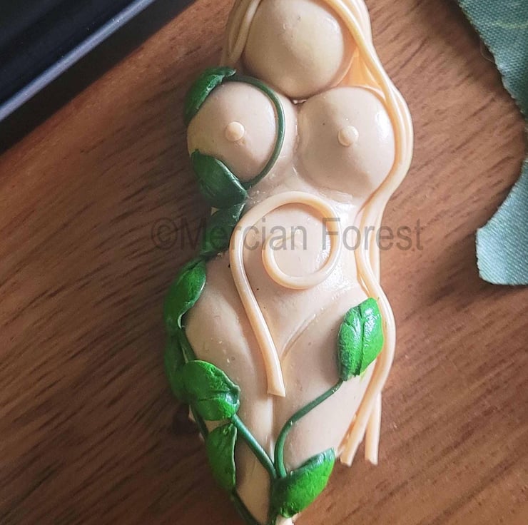 Gaia our earth mother goddess is made of flesh coloured clay, she measures around 6 cm in height and has a spiral on her tummy and long flowing locks cascading down towards her feet. Gaia has leaves and vines twisting and turning around her curves to the left. A pretty, yet understated piece we have sculpted and painted by hand.