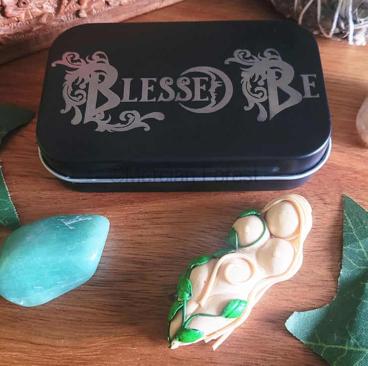 This listing is for a beautiful engraved Blessed Be Tin, from our very own Workshop, and a handmade altar goddess.
