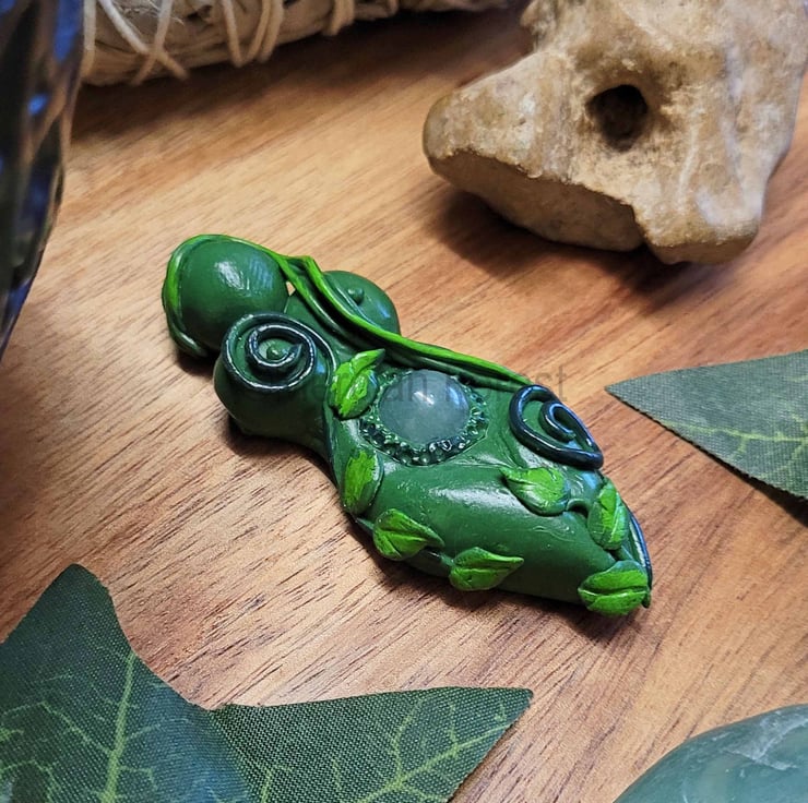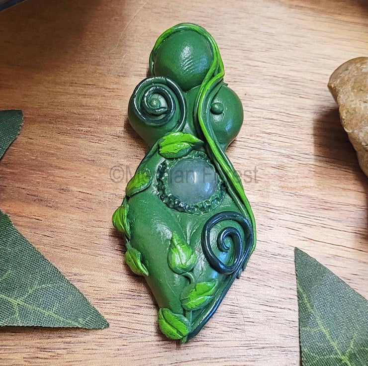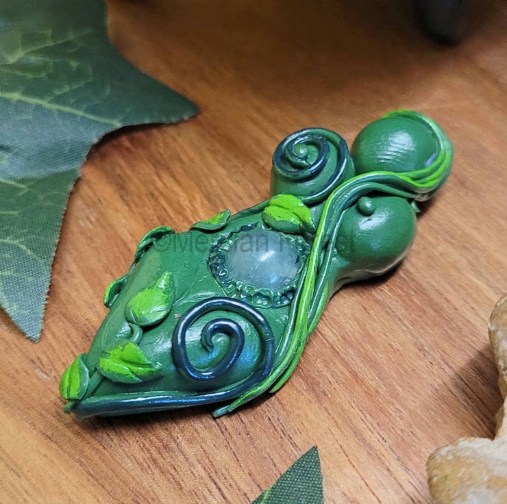 Gaia, our earth mother goddess, is made of polymer clay. She has an Aventurine in her tummy and long flowing locks cascading down towards her hips and measures around 6 cm.