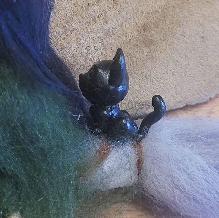 The precariously perched little witchling, appears to hold onto her broom for dear life as she travels at speed, without control giving me Worst Witch vibes! Her trusty black cat familiar is seated at the rear of the broom and our little witch holds onto a pumpkin ahead of her.